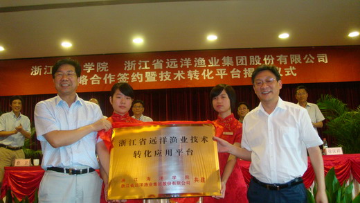 2010年7月23日,浙江海洋学院与浙江省远洋渔业集团公司在西子湖畔举行仪式,签署建立长期战略合作关系的协议书,共同组建“浙江省远洋渔业技术转化应用平台”,建立“浙江海洋学院产学研基地”。浙江省海洋与渔业局副局长俞永跃,浙江海洋学院党委书记周达军,浙江海洋学院副校长吴常文,浙江海洋学院党委委员、校长助理、浙江省海洋水产研究所所长徐汉祥,浙江省远洋渔业集团公司总经理曾岳祥出席签约仪式。仪式由浙江省远洋渔业集团公司副总经理詹伟主持。浙江省海洋与渔业局科技外经处负责人,学校办公室、地方合作处、水产学院、食药学院、船建学院、萧山学院有关负责人和教师代表,省远洋渔业集团公司及下属企业负责人共计40余人参加了仪式。