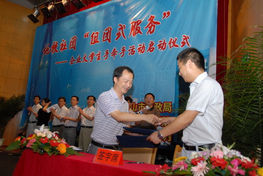 7月10日上午,浙江海洋学院团委与舟山市民政局民间组织管理局正式签订学校社团与地方行业协会“组团式服务”合作协议,揭牌成立组团式服务合作基地,这标志着浙江海洋学院学生社团组织牵手企业活动正式启动。我校党委书记周达军出席会议并讲话,市政府副秘书长戴登禄宣布校地合作“组团式服务”—企业大学生手牵手活动正式启动,校党委副书记、纪委书记宋富军,市民政局局长董佩芬和团市委、市民政局及民间组织管理局、市食品百货商会等单位、部门领导出席启动仪式,地方行业协会代表、校学生社团代表共500余人参加了启动仪式。