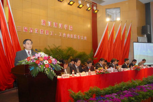 苗振清向大会作题为《强化内涵建设、谋求跨越发展、为全面创建浙江海洋大学打下坚实基础》的工作报告。报告回顾了学校2009年的主要工作和成绩,并布置了2010年学校的主要工作任务:一是突出战略重点,强化规划设计,抓好“三大规划”的执行和编制工作,启动“创建浙江海洋大学”工程和独立学院规范设置迎检工作,扎实推进校本部和萧山校区两项迁建工程。二是推进内部改革,完善体制机制,合理构建人力资源建设和管理体系,探索“两翼”办学的体制和机制,做好教职工岗位设置管理工作。三是围绕育人核心,提高教育质量,实施本科教育工程,做好专业结构调整和人才培养计划修订工作,进一步做好以抓学为主的学生管理和服务工作,全力做好招生就业工作。四是紧抓学科龙头,提升科研能力,重视专业学位点建设和新增博士单位规划立项工作,努力构建学校科研创新体系和科技创新平台。五是坚持开放办学,加强对外合作。积极参与浙江海洋经济发展带的建设,加强与大院大所的合作,推进多层次、多学科的国际合作办学。六是重视条件保障,创建和谐校园。做好学校迁建过渡期条件保障工作,提高学校办学和建设资金使用效益和后勤服务质量,不断完善服务体系。