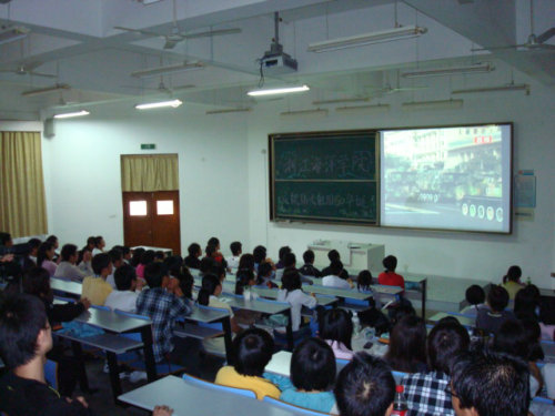 为了保证每位在校师生能及时全面地收看到庆典的最新进展,我校在东、西校区教学楼开放了四个集中收看点,从早上八时起面向全校师生全天开放,并有多个食堂的电视同时开放。为了见证这个伟大的历史性时刻,海院学子身在海岛,心向北京,不少学生早早来到教室门外守候,踊跃观看。在观看过程中,学生们不时高唱国歌,不时鼓掌助兴,一起分享着举国同庆的喜悦,感受着与国同欢的情怀,深刻体察着今日中国的军威国魂,共同见证着伟大祖国的繁荣富强。海院学子高涨的热情还吸引舟山电视台、舟山日报等多家新闻媒体单位纷纷前来采访、拍摄。据不完全统计,有2000余人通过学校集中组织全程观看了阅兵活动,更多的学生在宿舍和家中自觉全程收看收听了相关报道活动。大家纷纷表示,这次阅兵庆典气势恢宏,反映了祖国的富强昌盛,为自己身为一名中国人而感到无比光荣,为自己能亲身经历这个伟大时刻而无比激动,今后将更加刻苦学习,修身实践,用自己的知识和汗水报效国家、服务社会。