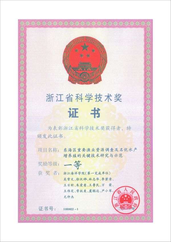 5月2日下午,省委、省政府召开全省推进国家技术创新工程试点省建设工作电视电话会议,表彰2011年度在全省科技工作方面做出突出贡献的先进单位和个人,由我校吴常文教授和徐汉祥研究员牵头的“东海区重要渔业资源调查及名优水产增养殖的关键技术研究与示范”项目,荣获2011年度浙江省科学技术奖一等奖。
