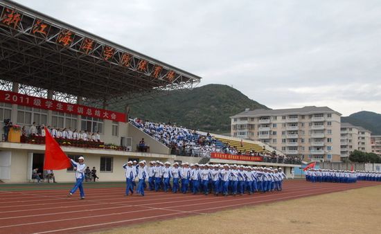9月25日上午,浙江海洋学院、浙江海洋学院东海科学技术学院2011级新生军训总结大会在东校区田径场隆重举行。浙江海洋学院党委书记周达军检阅参训方队,浙江海洋学院校长、东海科学技术学院董事长苗振清和中国人民解放军海军舟山保障基地副司令员周江平出席大会并讲话,校党政领导班子成员宋富军、黄建钢、虞聪达、徐士元、任淑华和海军保障基地军务处处长包余,以及学校军训领导小组成员、教官代表出席大会。