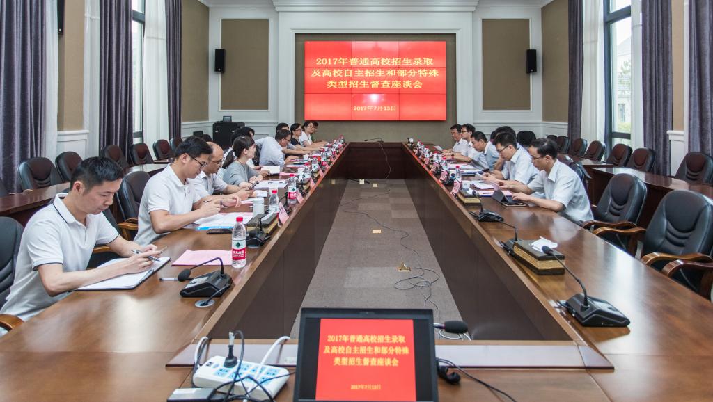 督查组听取了各高校关于2017年招生录取工作准备与实施情况的汇报,以及各高校对普通高校招生录取工作和上海、浙江高招改革实施工作的意见与建议。我校招生就业指导处负责人从工作保障、政策执行、信息公开与监督、宣传服务等四个方面汇报了学校2017年招生录取工作准备情况、招生录取工作进展与计划执行情况。