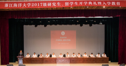 教师代表水产学院王迎宾老师、老生代表校学生会主席毛晨浩、新生代表外国语学院吕立华分别发言。在《拥抱海洋》的歌声中,学校领导为“2017级优秀本科新生奖学金”获得者代表颁发证书,并为新生代表佩戴校徽。