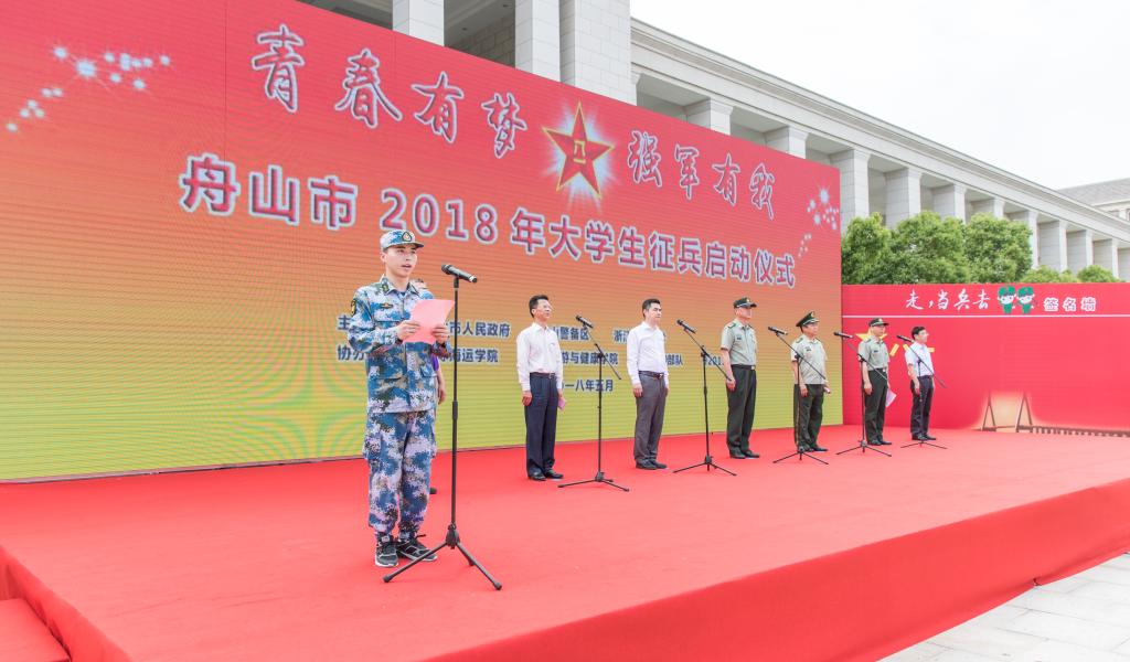 近日,舟山市2018年大学生征兵启动仪式在我校举行。舟山警备区政治委员冯阜营、舟山警备区司令员武春辉、舟山市政府副秘书长郑海、浙江海洋大学党委副书记吴中平等领导出席仪式。来自驻舟部队的50余名陆军、海军官兵代表以及浙江海洋大学、浙江国际海运职业学院等在舟高校的450余名优秀大学生代表参加仪式。