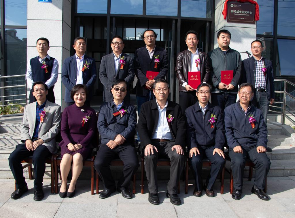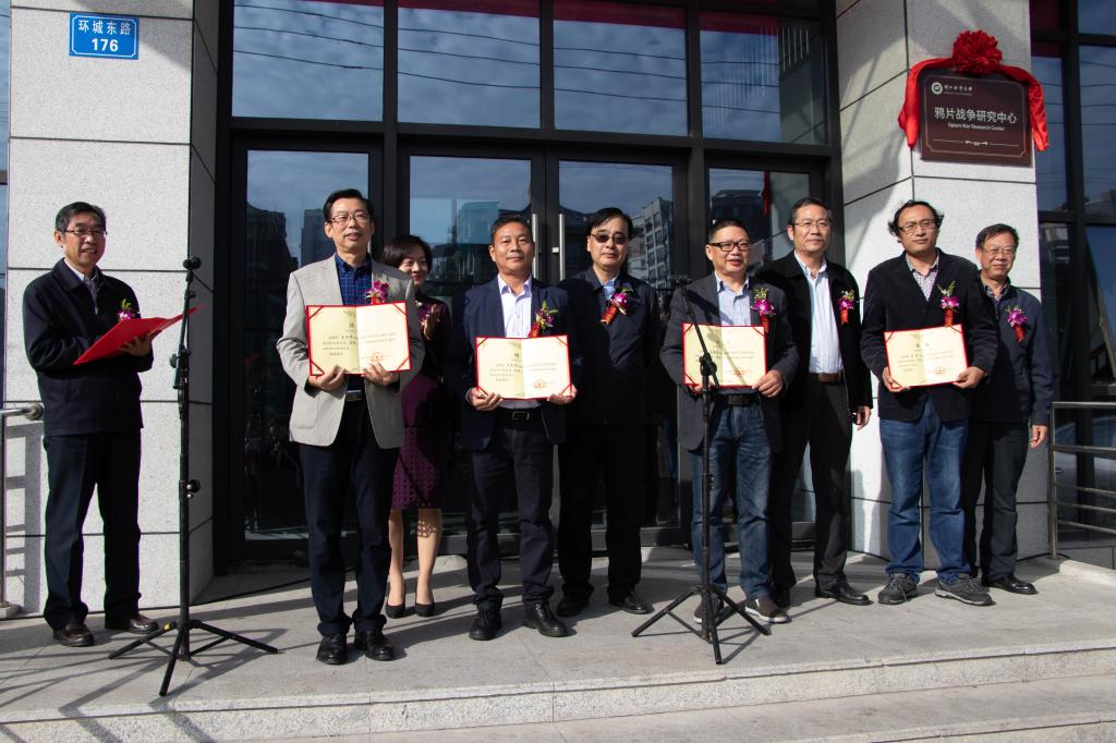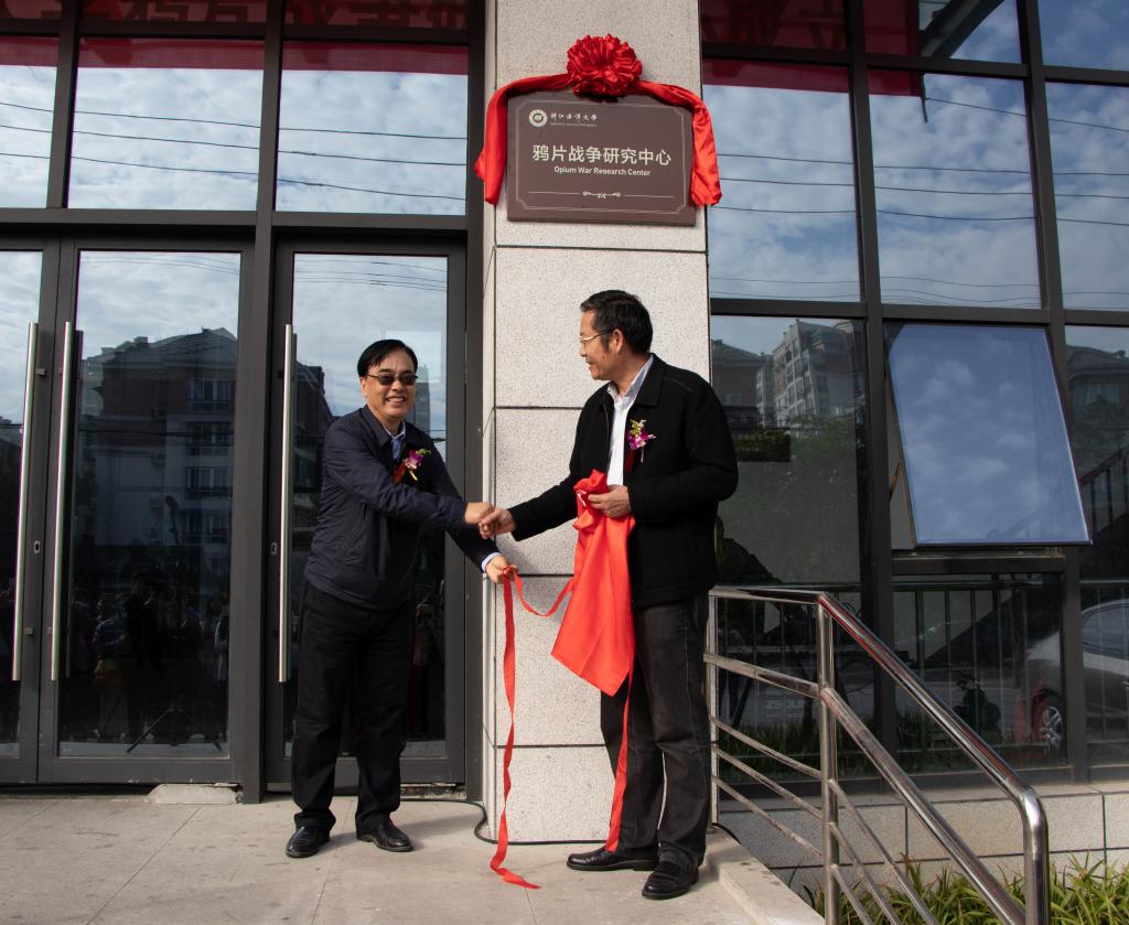 工作人员宣读中国社会科学院近代史研究员、鸦片战争研究专家郦永庆的贺信以及关于成立浙江海洋大学鸦片战争研究中心和聘任名誉主任、研究员及助理研究员的相关文件;随后徐汉祥副校长、卜键主任为研究中心揭牌。