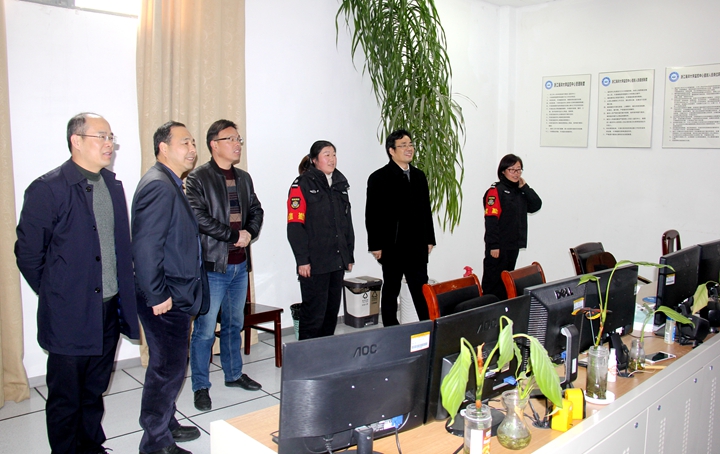 严小军等校领导在学校监控中心查看寒假值班人员工作情况。校办/供图
