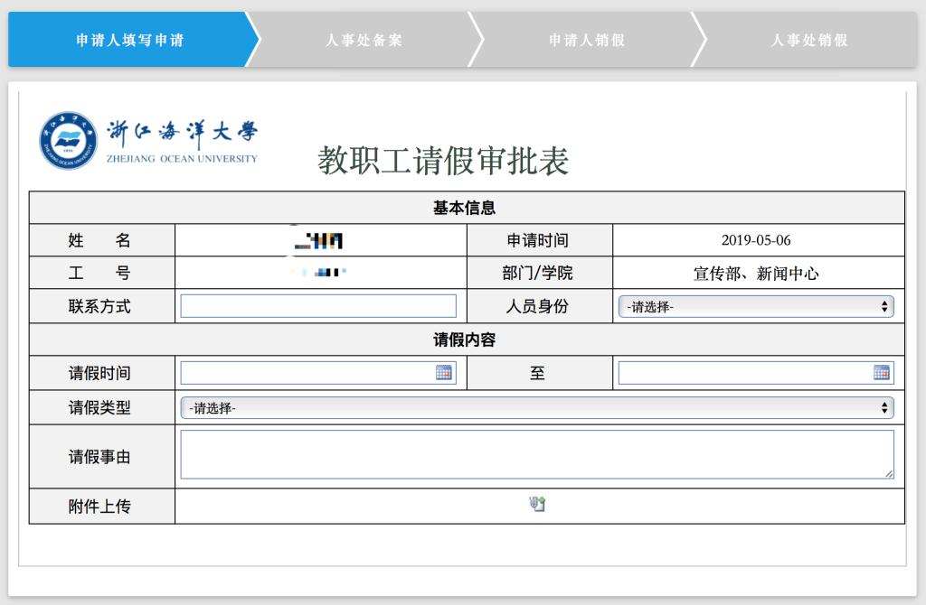 记者实际体验了一下“教职工请假审批”,个人信息系统会自动填充完成,只需填写请假事由和请假周期即可提交相关人员审批,免去了填写、打印、签字、盖章等一系列环节,大大方便了实际操作。