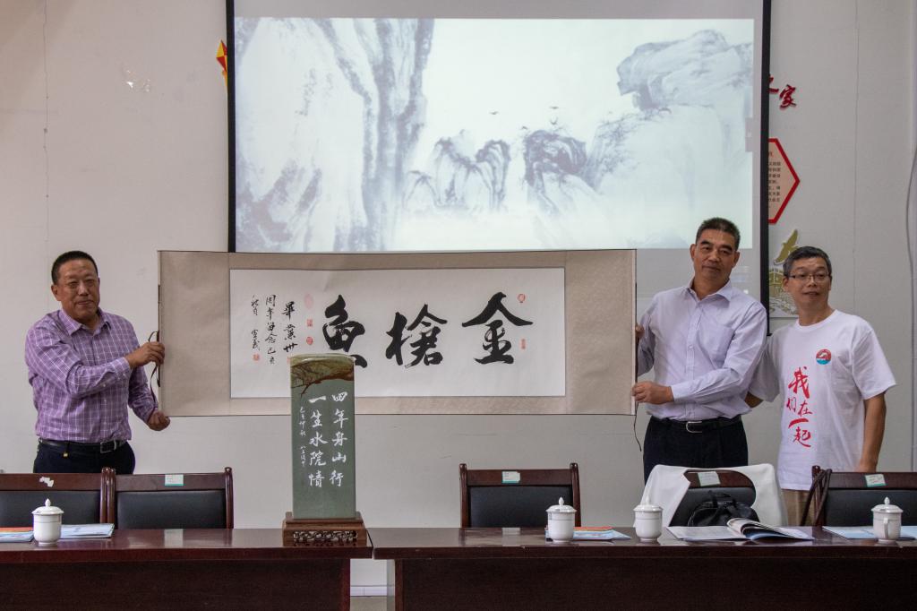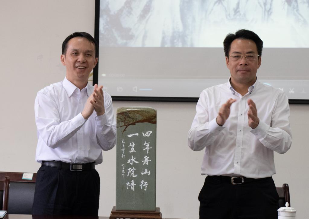 校友们向学校赠送了镌刻有“四年舟山行,一生水院情”的玉石纪念碑和题写有当年水产学院“金枪鱼”足球队队名的字画。