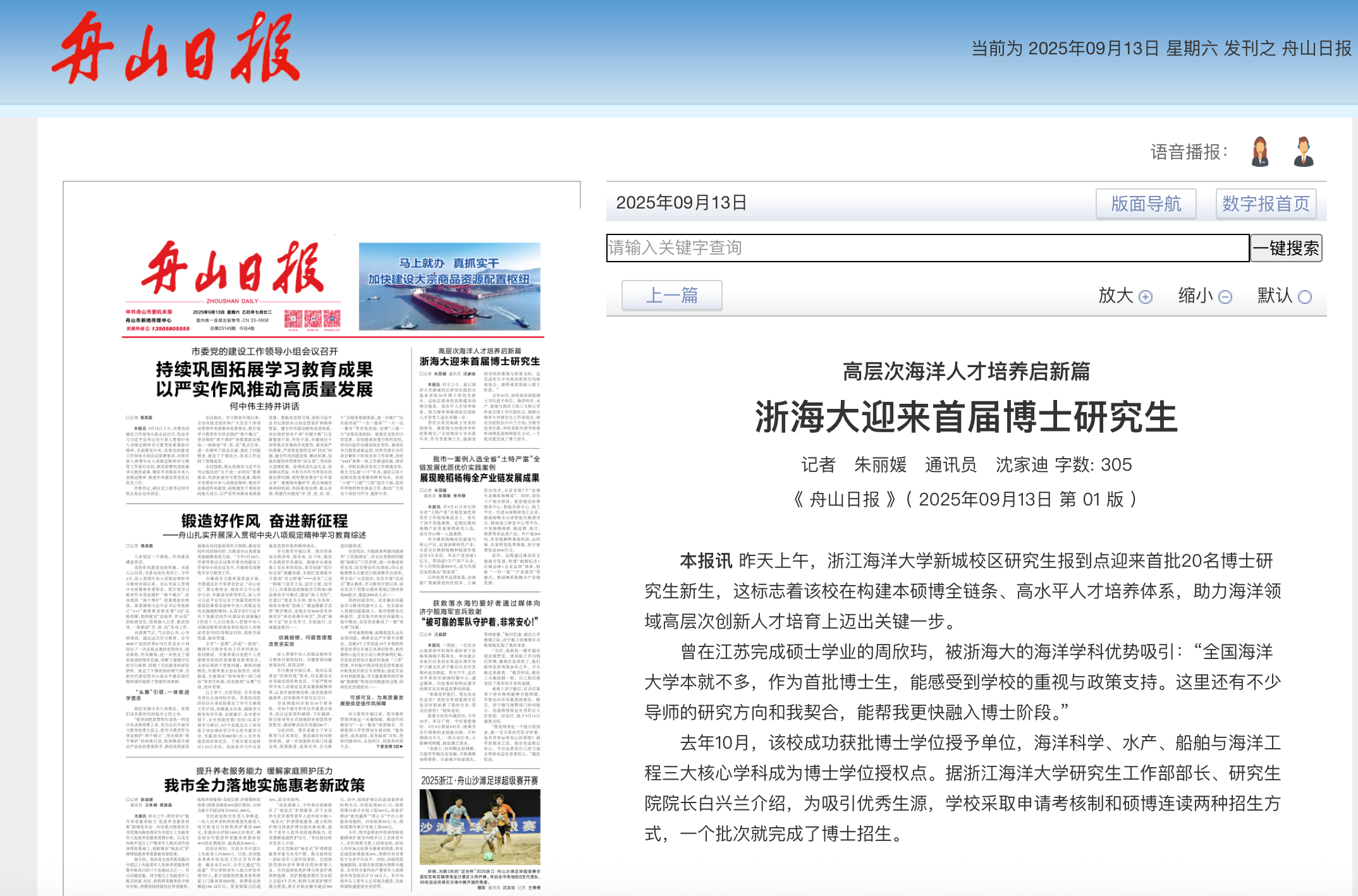 9月12日上午,浙江海洋大学新城校区研究生报到点迎来首批20名博士研究生新生,这标志着该校在构建本硕博全链条、高水平人才培养体系,助力海洋领域高层次创新人才培育上迈出关键一步。曾在江苏完成硕士学业的周欣玙,被浙海大的海洋学科优势吸引:“全国海洋大学本就不多,作为首批博士生,能感受到学校的重视与政策支持...