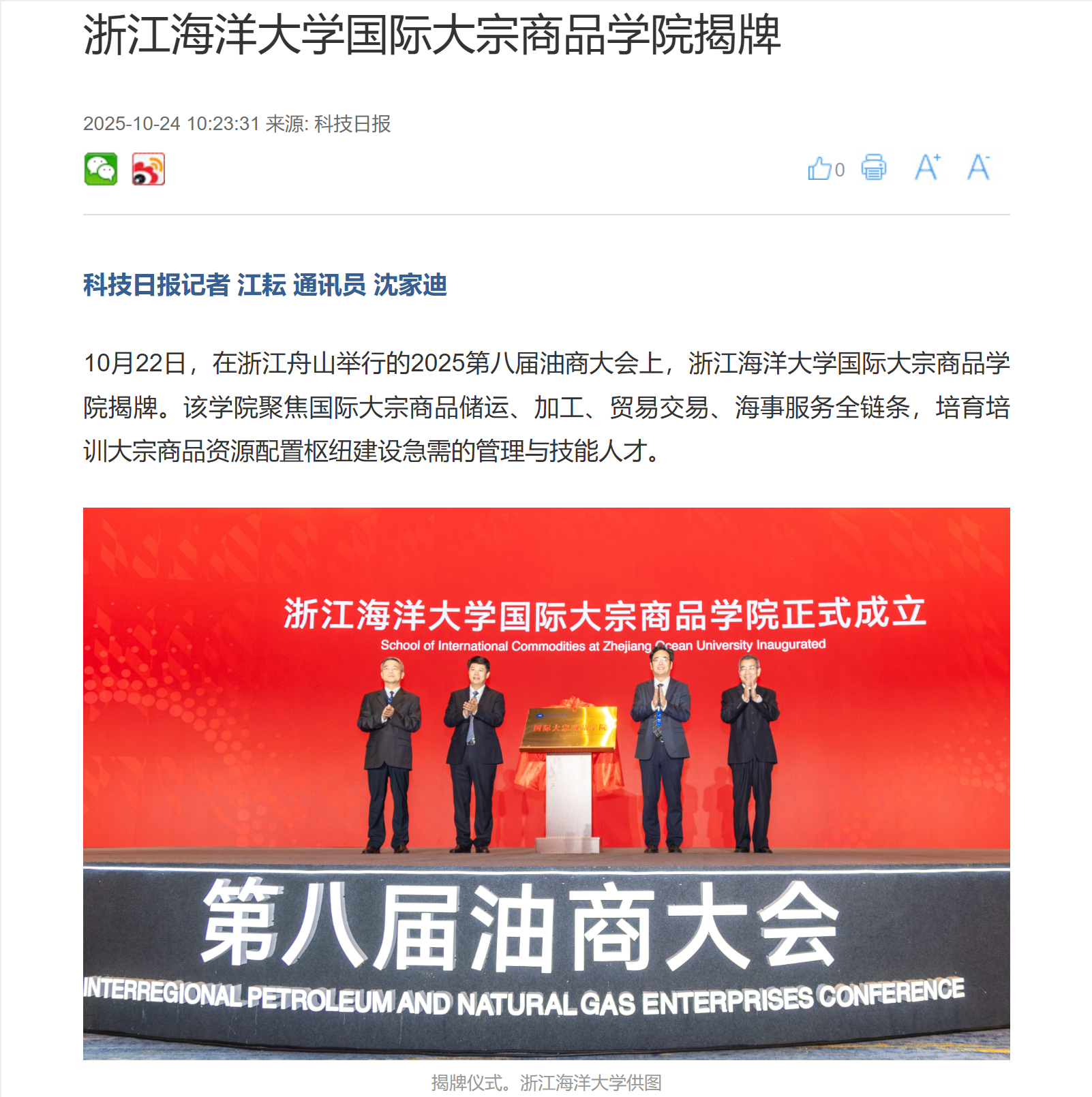 10月22日,在浙江舟山举行的2025第八届油商大会上,浙江海洋大学国际大宗商品学院揭牌。该学院聚焦国际大宗商品储运、加工、贸易交易、海事服务全链条,培育培训大宗商品资源配置枢纽建设急需的管理与技能人才。浙江海洋大学国际大宗商品学院是落实国务院关于《中国(浙江)自由贸易试验区大宗商品资源配置枢纽建设方案...