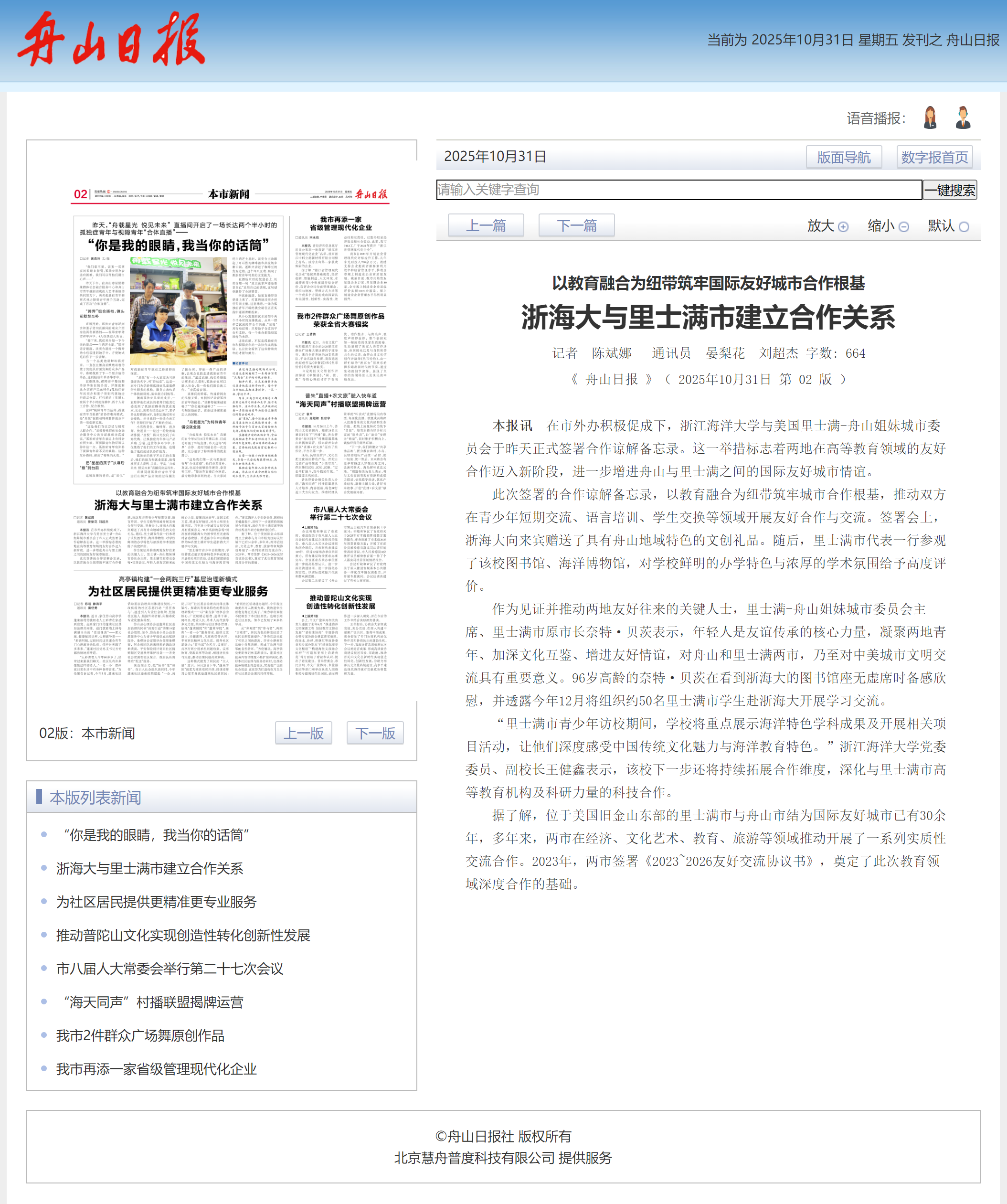 在市外办积极促成下,浙江海洋大学与美国里士满-舟山姐妹城市委员会于昨天正式签署合作谅解备忘录。这一举措标志着两地在高等教育领域的友好合作迈入新阶段,进一步增进舟山与里士满之间的国际友好城市情谊。此次签署的合作谅解备忘录,以教育融合为纽带筑牢城市合作根基,推动双方在青少年短期交流、语言培训、学生交换...