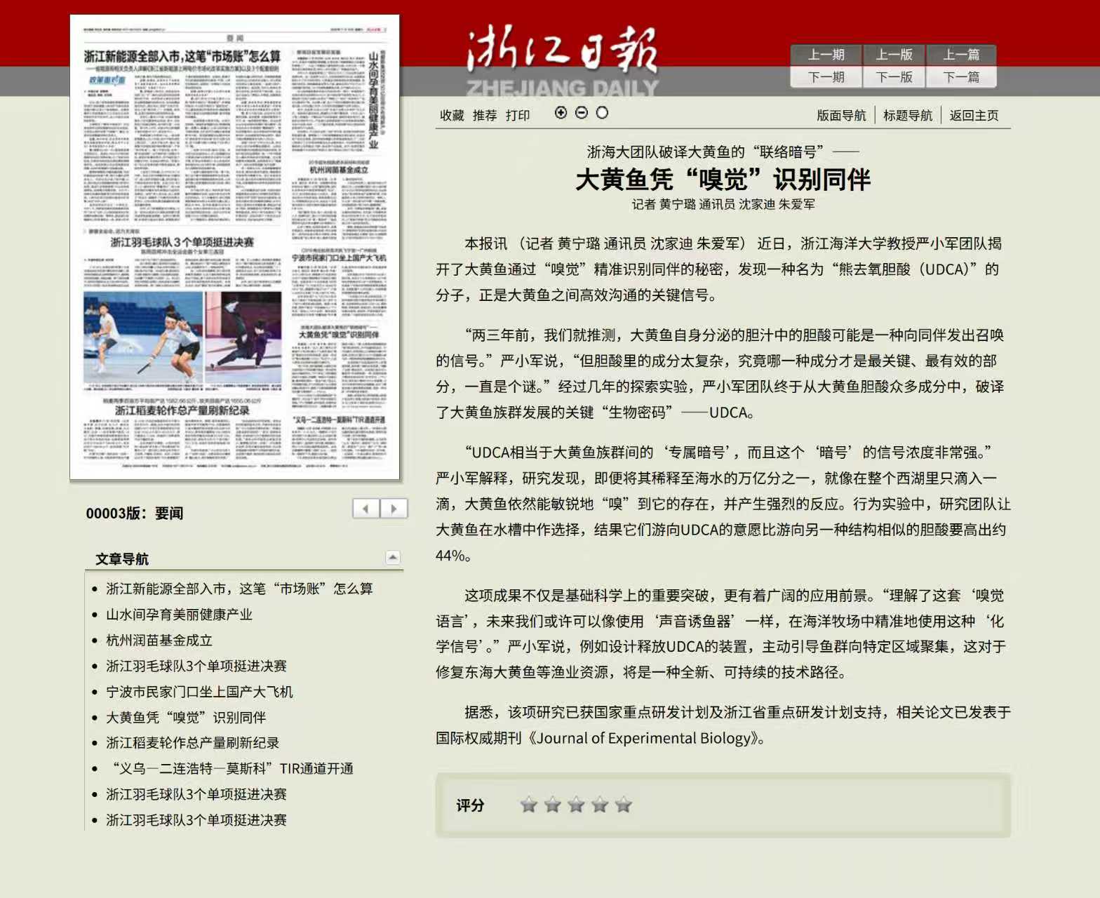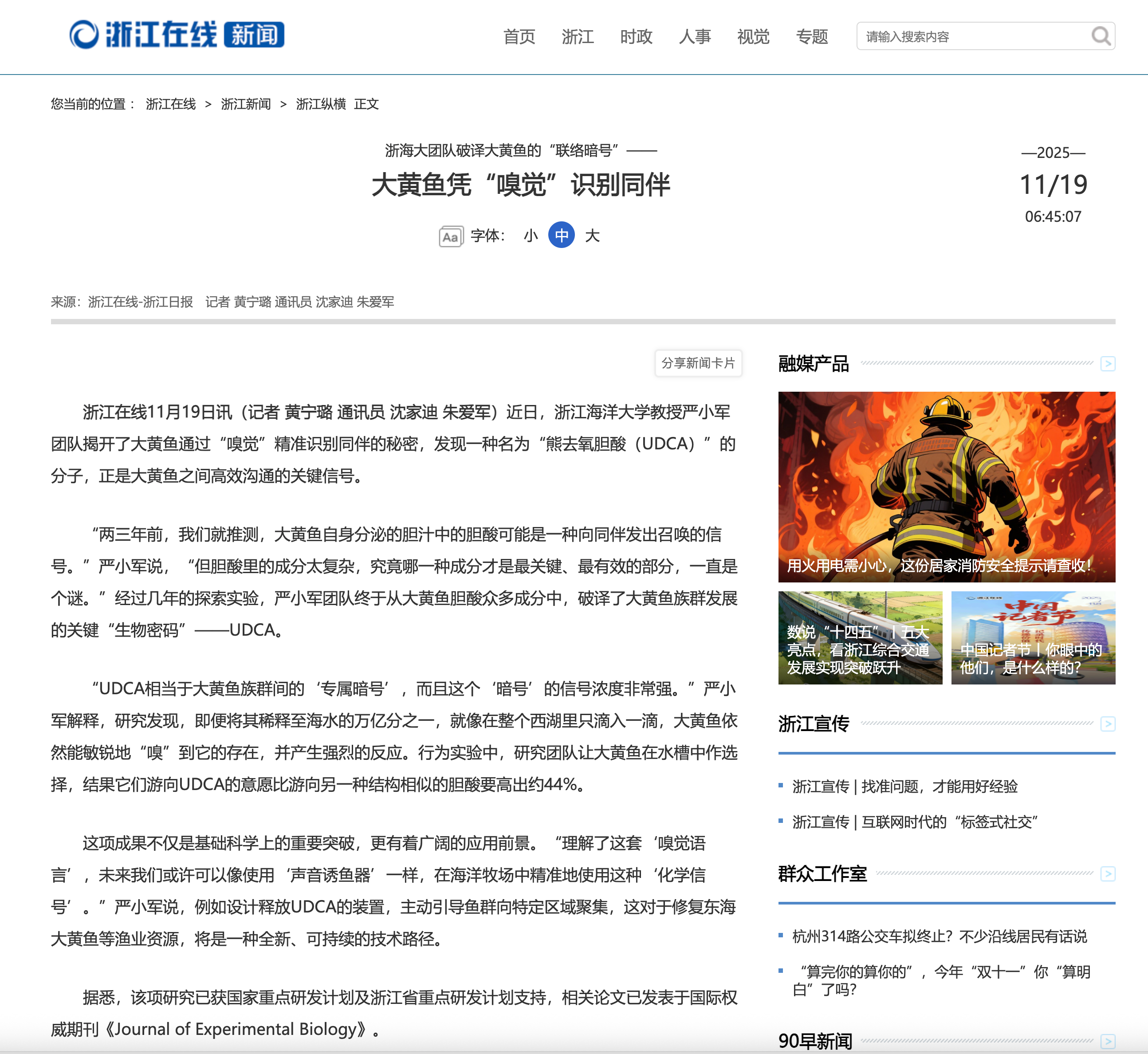 在昏暗又“静音”的海洋深处,大黄鱼是怎么精准找到同伴、抱团成鱼群的?今天,记者从浙江海洋大学了解到一项重磅消息:严小军教授团队在国际期刊《实验生物学杂志》发表研究成果,终于揭开了这个秘密——大黄鱼靠“嗅觉”认亲,而背后的关键“暗号”,是一种叫熊去氧胆酸(UDCA)的物质!来听浙江海洋大学党委书记、教...