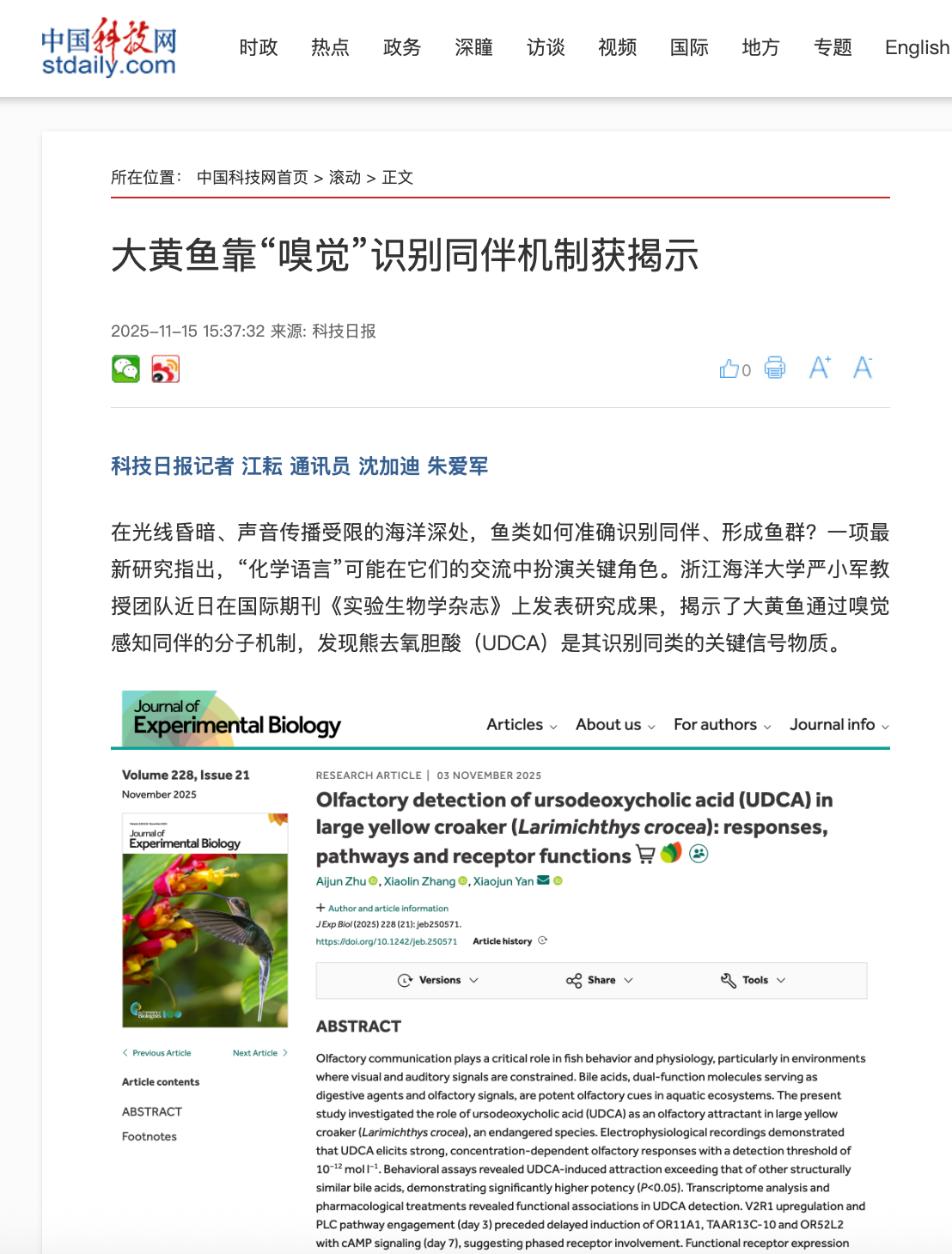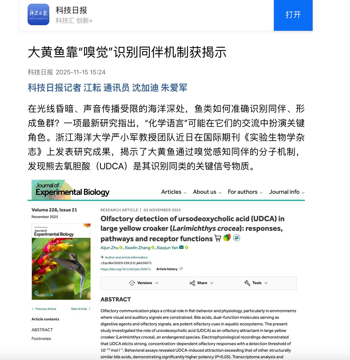 在光线昏暗、声音传播受限的海洋深处,鱼类如何准确识别同伴、形成鱼群?一项最新研究指出,“化学语言”可能在它们的交流中扮演关键角色。浙江海洋大学严小军教授团队近日在国际期刊《实验生物学杂志》上发表研究成果,揭示了大黄鱼通过嗅觉感知同伴的分子机制,发现熊去氧胆酸(UDCA)是其识别同类的关键信号物质。严...