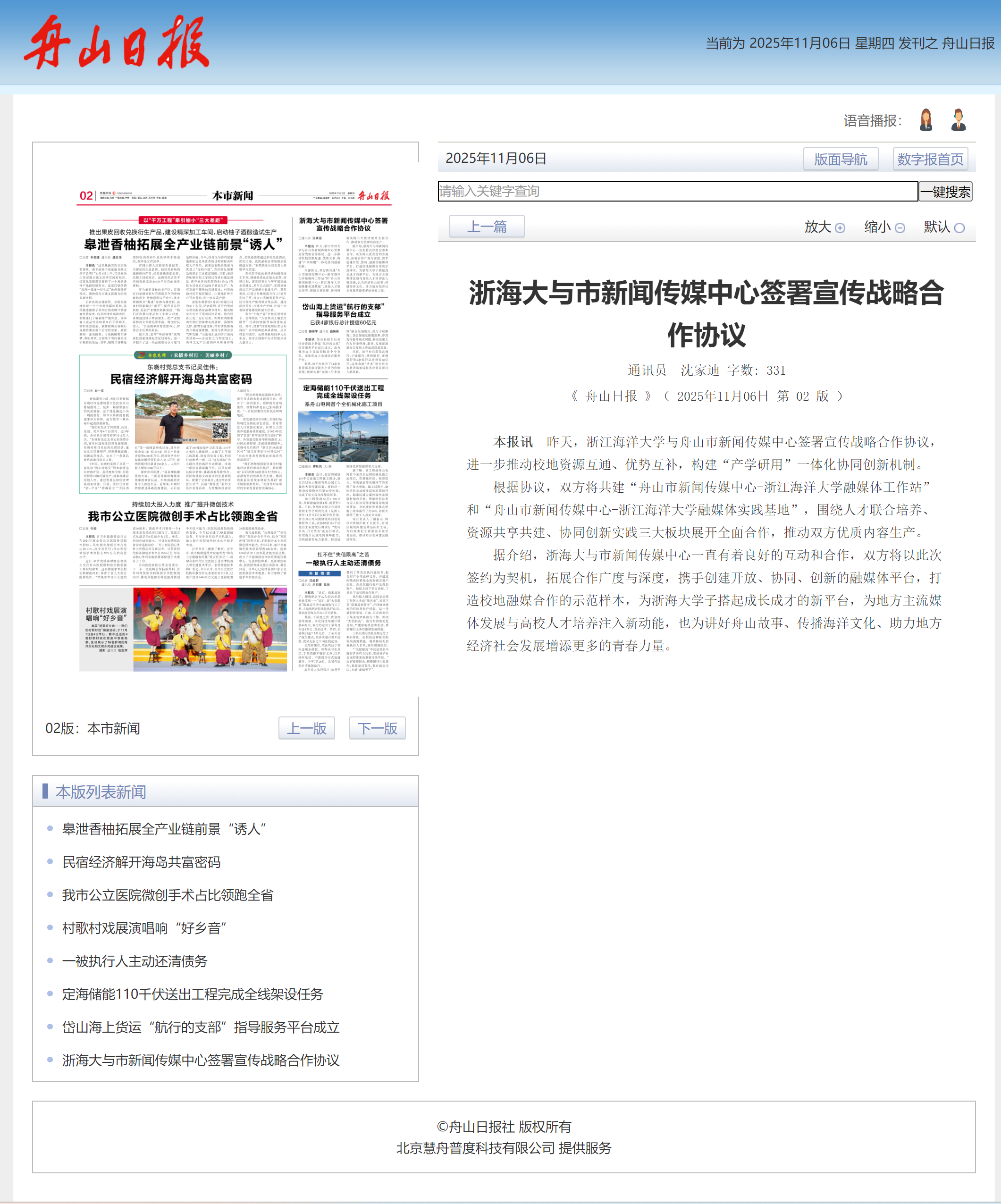 昨天,浙江海洋大学与舟山市新闻传媒中心签署宣传战略合作协议,进一步推动校地资源互通、优势互补,构建“产学研用”一体化协同创新机制。根据协议,双方将共建“舟山市新闻传媒中心-浙江海洋大学融媒体工作站”和“舟山市新闻传媒中心-浙江海洋大学融媒体实践基地”,围绕人才联合培养、资源共享共建、协同创新实践三...