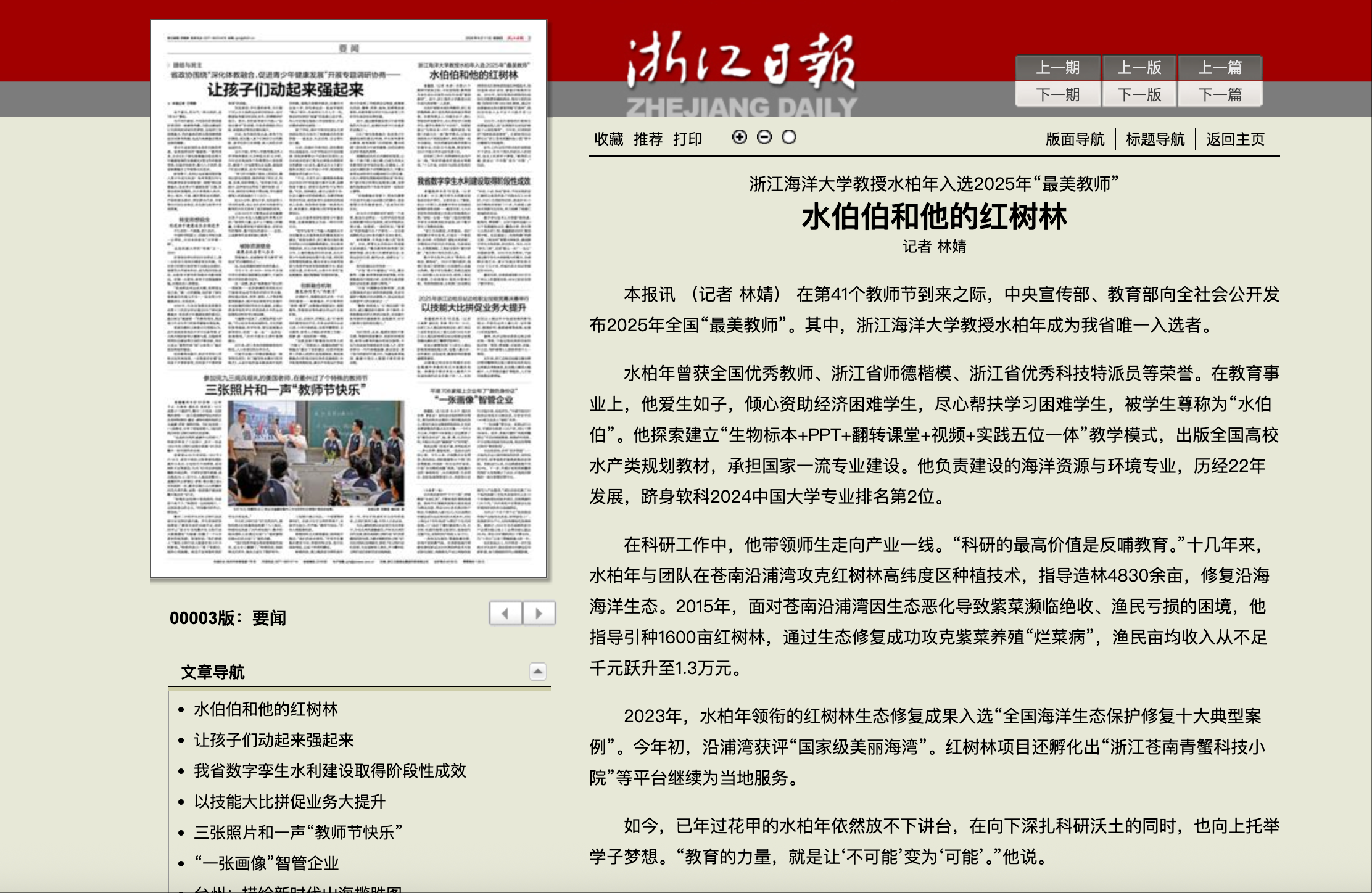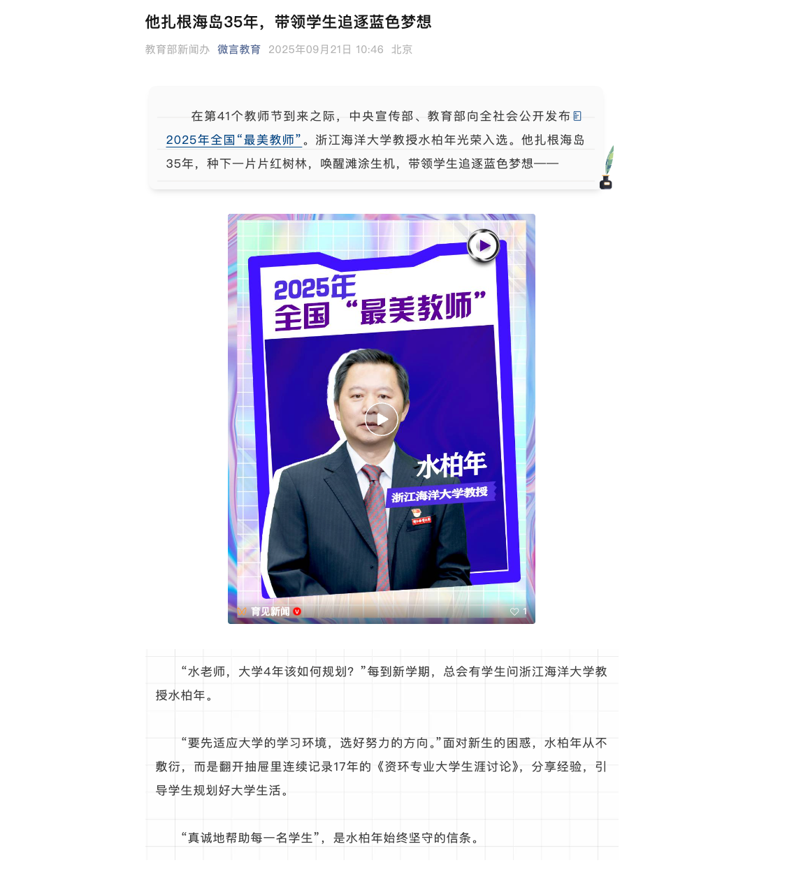 在第41个教师节到来之际,中央宣传部、教育部向全社会公开发布2025年全国“最美教师”。其中,浙江海洋大学教授水柏年成为我省唯一入选者。水柏年曾获全国优秀教师、浙江省师德楷模、浙江省优秀科技特派员等荣誉。在教育事业上,他爱生如子,倾心资助经济困难学生,尽心帮扶学习困难学生,被学生尊称为“水伯伯”。他探...