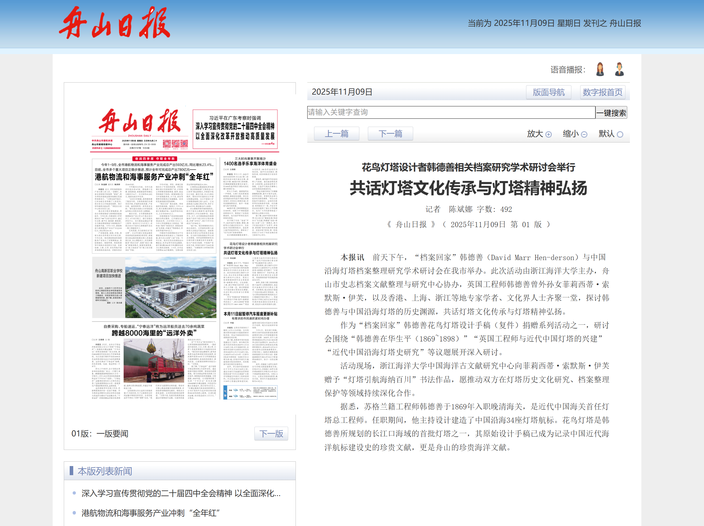 本报讯前天下午,“档案回家”韩德善(DavidMarrHen-derson)与中国沿海灯塔档案整理研究学术研讨会在我市举办。此次活动由浙江海洋大学主办,舟山市史志档案文献整理与研究中心协办,英国工程师韩德善曾外孙女菲莉西蒂·索默斯·伊芙,以及香港、上海、浙江等地专家学者、文化界人士齐聚一堂,探讨韩德善与中国沿海灯塔的...
