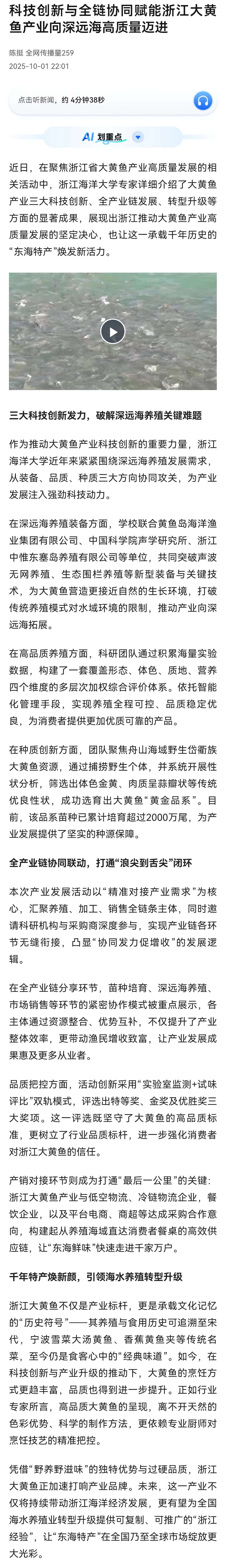 近日,在聚焦浙江省大黄鱼产业高质量发展的相关活动中,浙江海洋大学专家详细介绍了大黄鱼产业三大科技创新、全产业链发展、转型升级等方面的显著成果,展现出浙江推动大黄鱼产业高质量发展的坚定决心,也让这一承载千年历史的“东海特产”焕发新活力。三大科技创新发力,破解深远海养殖关键难题作为推动大黄鱼产业科技...