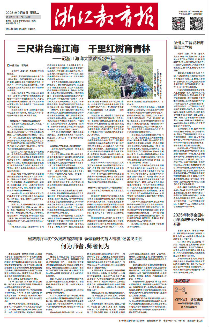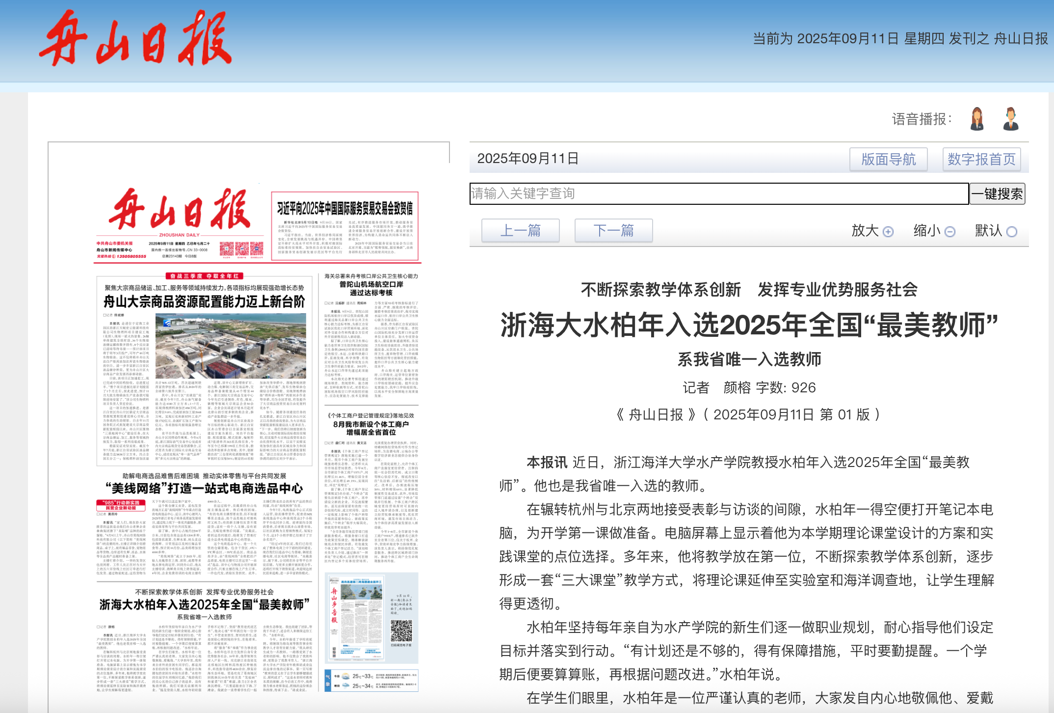 近日,浙江海洋大学水产学院教授水柏年入选2025年全国“最美教师”。他也是我省唯一入选的教师。在辗转杭州与北京两地接受表彰与访谈的间隙,水柏年一得空便打开笔记本电脑,为开学第一课做准备。电脑屏幕上显示着他为本学期理论课堂设计的方案和实践课堂的点位选择。多年来,他将教学放在第一位,不断探索教学体系创新...
