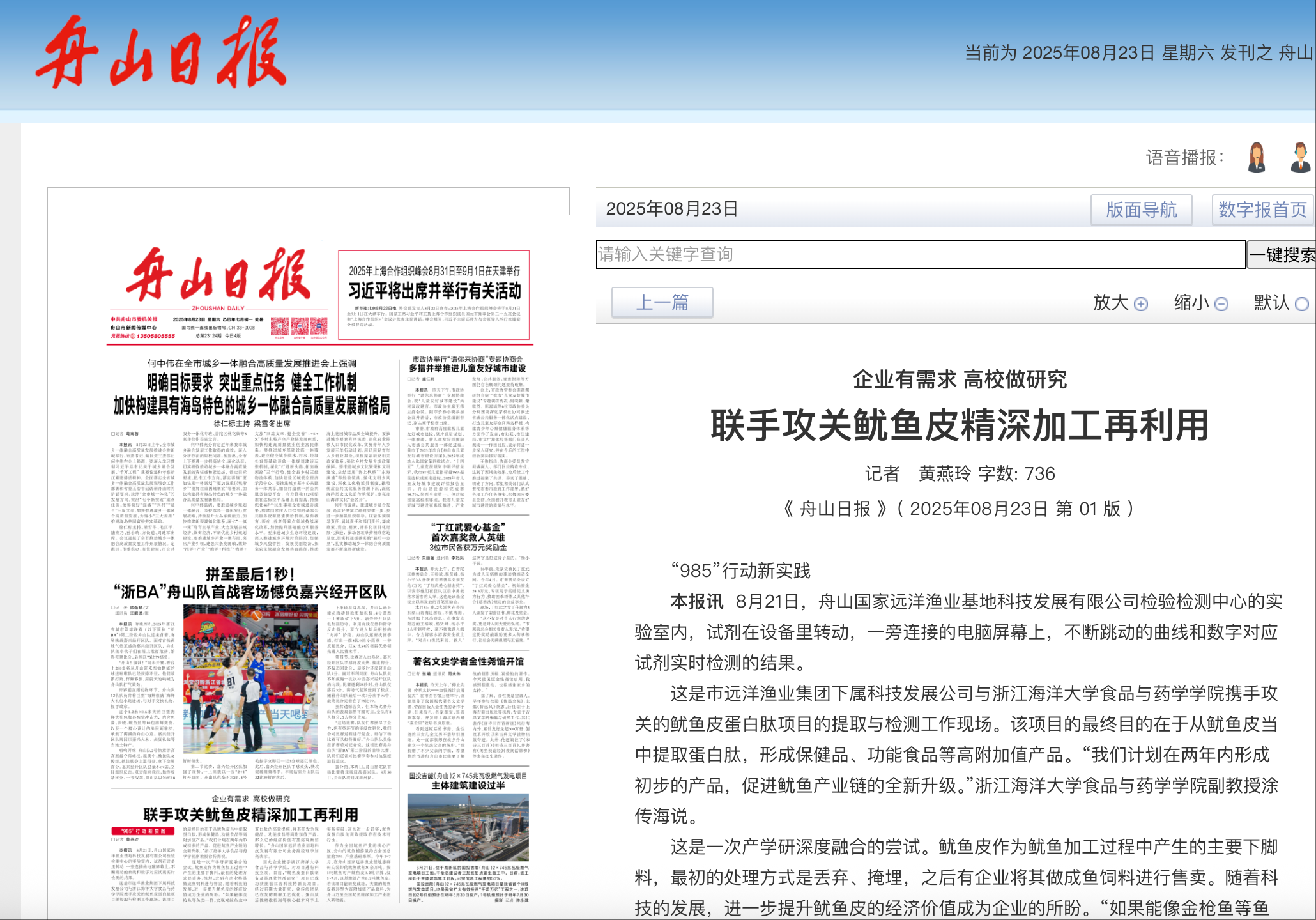8月21日,舟山国家远洋渔业基地科技发展有限公司检验检测中心的实验室内,试剂在设备里转动,一旁连接的电脑屏幕上,不断跳动的曲线和数字对应试剂实时检测的结果。这是市远洋渔业集团下属科技发展公司与浙江海洋大学食品与药学学院携手攻关的鱿鱼皮蛋白肽项目的提取与检测工作现场。该项目的最终目的在于从鱿鱼皮当中提...