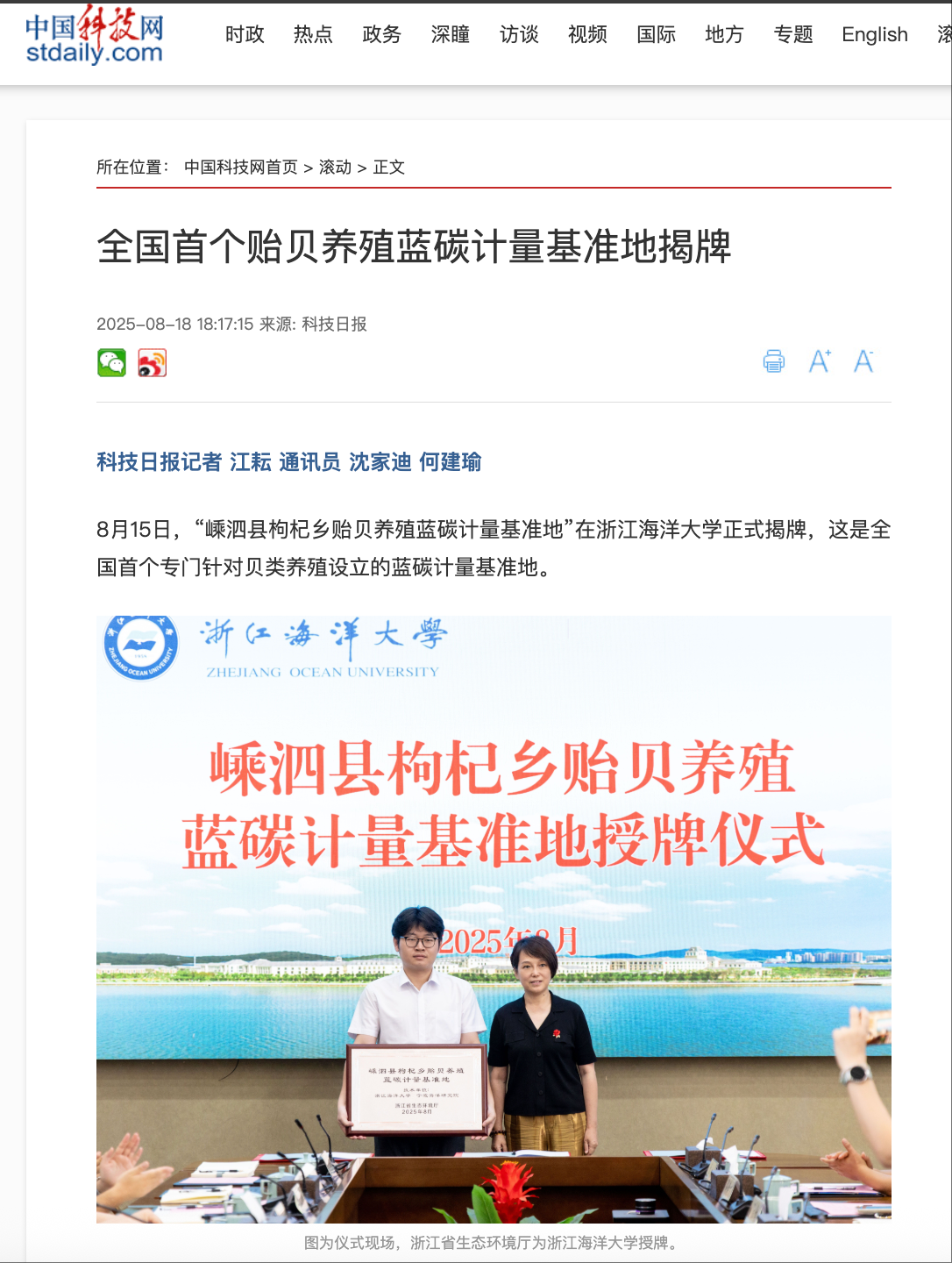 8月15日上午,全国首个贻贝养殖蓝碳计量基准基地——嵊泗县枸杞乡贻贝养殖蓝碳计量基准地在浙江海洋大学揭牌。该基准地的建立,填补了国内贝类养殖蓝碳计量参考地的空白,为我国“双碳”目标实现提供技术支撑和示范样板。仪式现场,浙江省生态环境厅、浙江海洋大学、嵊泗县枸杞乡政府、嵊泗山海奇观海洋科技开发有限公司...