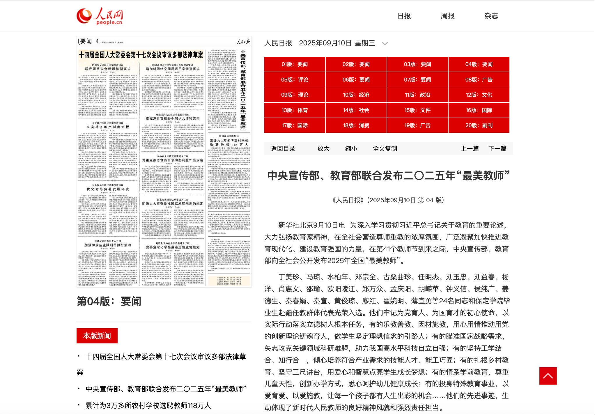 新华社北京9月10日电为深入学习贯彻习近平总书记关于教育的重要论述,大力弘扬教育家精神,在全社会营造尊师重教的浓厚氛围,广泛凝聚加快推进教育现代化、建设教育强国的力量,在第41个教师节到来之际,中央宣传部、教育部向全社会公开发布2025年全国“最美教师”。丁美珍、马琼、水柏年、邓宗全、古桑曲珍、任明杰、刘...