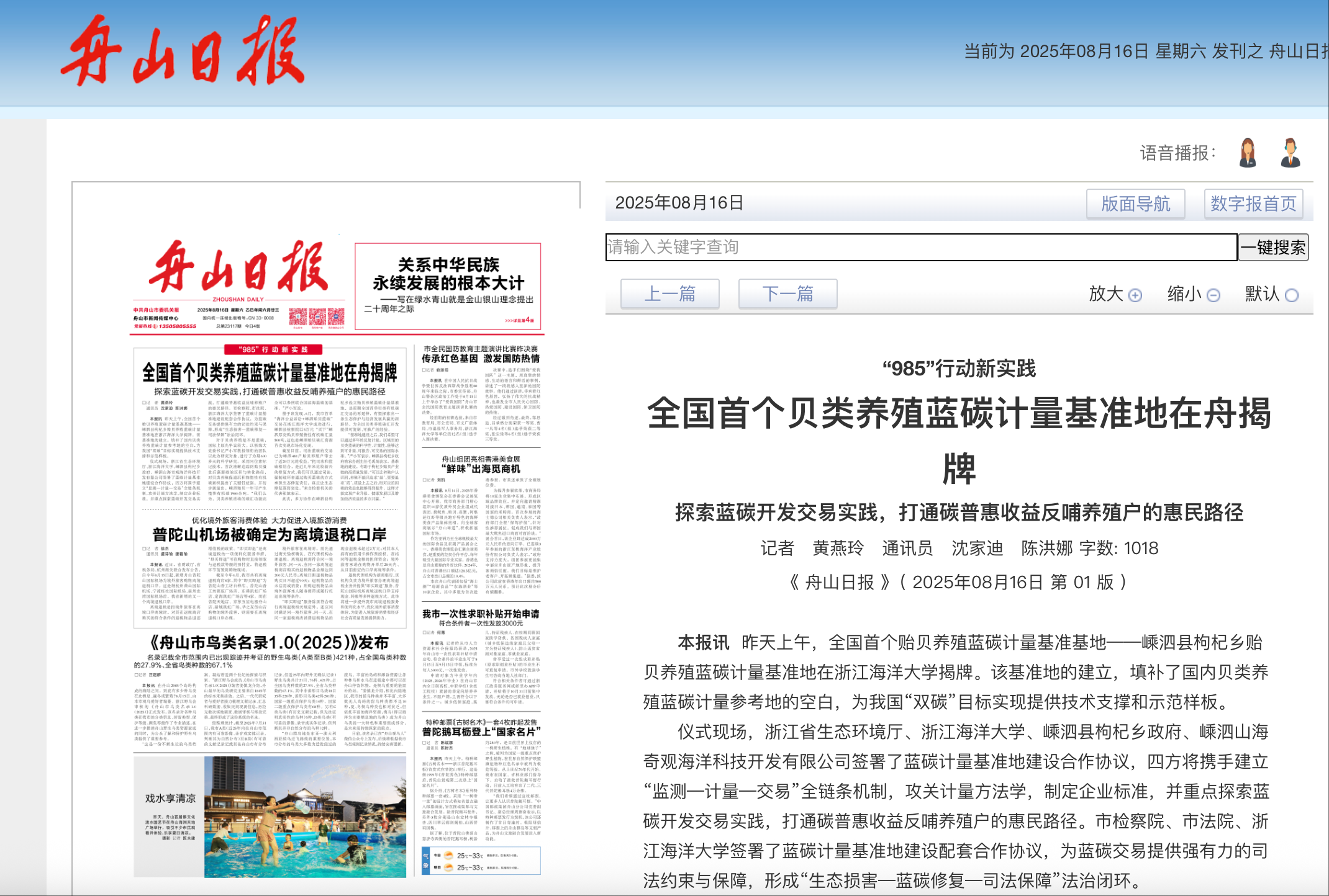 8月15日,“嵊泗县枸杞乡贻贝养殖蓝碳计量基准地”在浙江海洋大学正式揭牌,这是全国首个专门针对贝类养殖设立的蓝碳计量基准地。浙江舟山嵊泗县是全国最大的厚壳贻贝养殖基地,被誉为“贻贝之乡”。2024年,嵊泗贻贝养殖总面积达3.14万亩,年产量24.73万吨,其中枸杞乡就占了2.23万亩。其成熟的筏式立体养殖模式、完善...