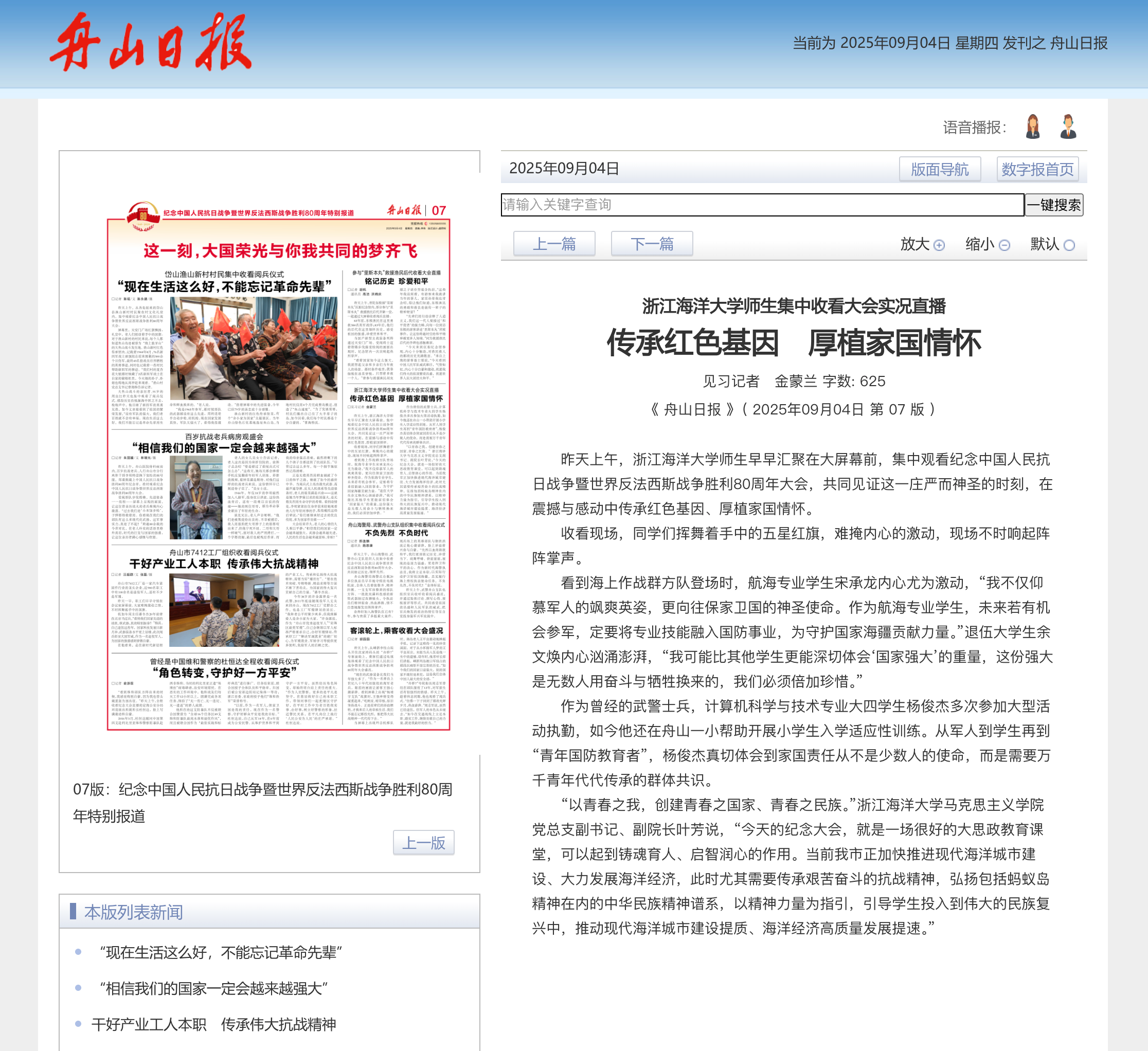 9月3日上午,浙江海洋大学师生早早汇聚在大屏幕前,集中观看纪念中国人民抗日战争暨世界反法西斯战争胜利80周年大会,共同见证这一庄严而神圣的时刻,在震撼与感动中传承红色基因、厚植家国情怀。收看现场,同学们挥舞着手中的五星红旗,难掩内心的激动,现场不时响起阵阵掌声。看到海上作战群方队登场时,航海专业学生...