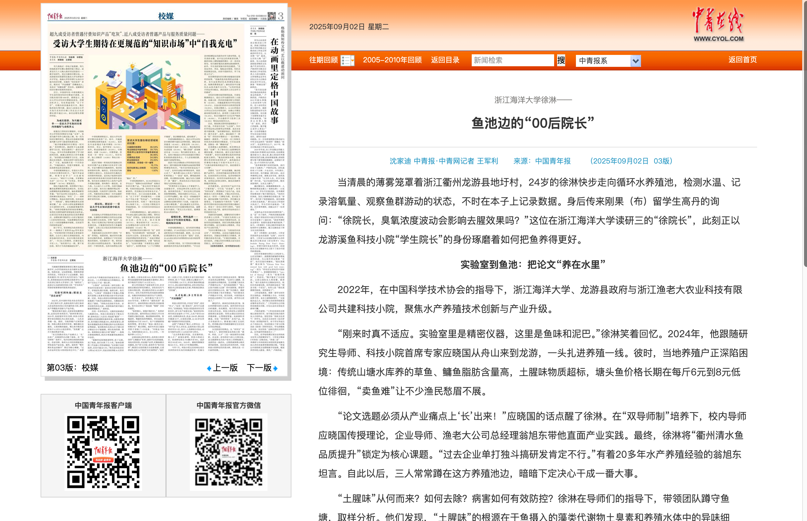 当清晨的薄雾笼罩着浙江衢州龙游县地圩村,24岁的徐淋快步走向循环水养殖池,检测水温、记录溶氧量、观察鱼群游动的状态,不时在本子上记录数据。身后传来刚果(布)留学生高丹的询问:“徐院长,臭氧浓度波动会影响去腥效果吗?”这位在浙江海洋大学读研三的“徐院长”,此刻正以龙游溪鱼科技小院“学生院长”的身份琢...