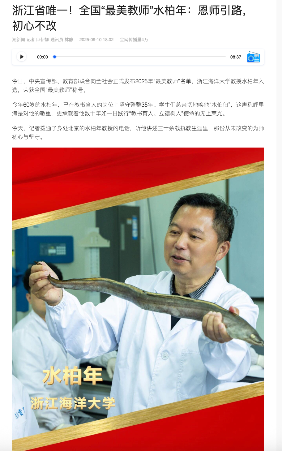 9月10日,中央宣传部、教育部联合向全社会正式发布2025年“最美教师”名单,浙江海洋大学教授水柏年入选,荣获全国“最美教师”称号。今年60岁的水柏年,已在教书育人的岗位上坚守整整35年。学生们总亲切地唤他“水伯伯”,这声称呼里满是对他的敬重,更承载着他数十年如一日践行“教书育人、立德树人”使命的无上荣光。...
