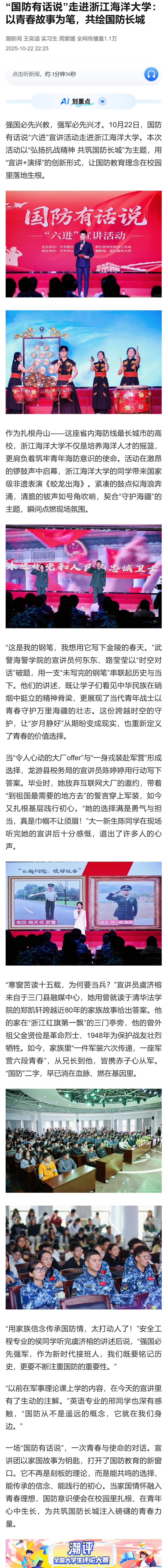 强国必先兴教,强军必先兴才。10月22日,国防有话说“六进”宣讲活动走进浙江海洋大学。本次活动以“弘扬抗战精神共筑国防长城”为主题,用“宣讲+演绎”的创新形式,让国防教育理念在校园里落地生根。作为扎根舟山——这座省内海防线最长城市的高校,浙江海洋大学不仅是培养海洋人才的摇篮,更肩负着筑牢青年海防意识的...