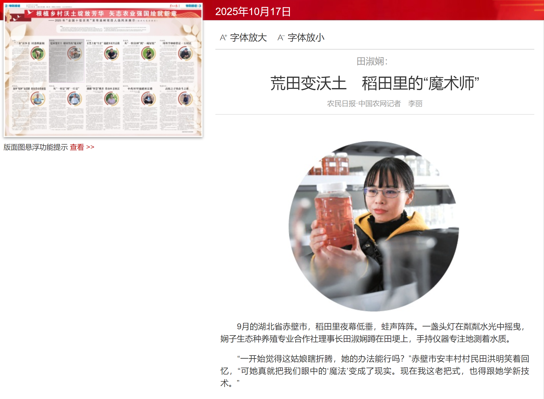 田淑娴的农业梦早在少年时期就已生根。20年前,看着父母面朝黄土背朝天却收入微薄,年少的田淑娴暗下决心:一定要让土地产出更高效益。她在浙江海洋大学攻读捕捞学硕士学位期间,专注于渔业资源可持续发展研究。在南麂列岛,她对潮间带藻场修复及贝藻生态系统进行深入探索,以第一作者身份发表学术论文,参与研发的“浮...