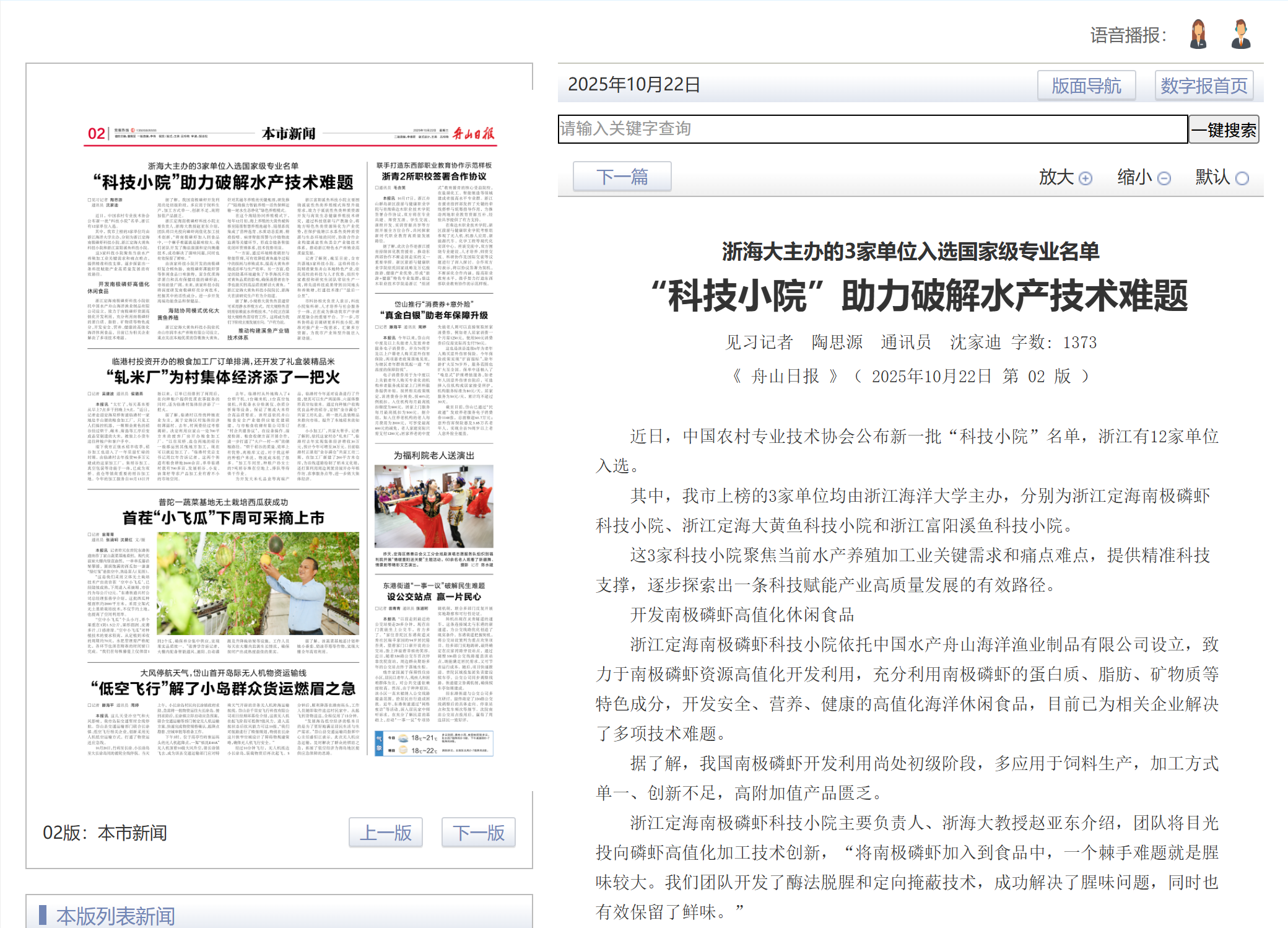 近日,中国农村专业技术协会公布新一批“科技小院”名单,浙江有12家单位入选。其中,我市上榜的3家单位均由浙江海洋大学主办,分别为浙江定海南极磷虾科技小院、浙江定海大黄鱼科技小院和浙江富阳溪鱼科技小院。这3家科技小院聚焦当前水产养殖加工业关键需求和痛点难点,提供精准科技支撑,逐步探索出一条科技赋能产业...