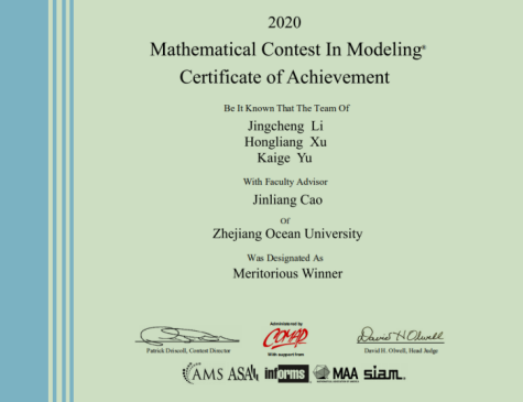 近期,2020年美国大学生数学建模竞赛(MCM/ICM)结果揭晓,浙江海洋大学5支学生参赛团队中,李竟成、徐宏亮、余恺歌同学组建的团队(指导教师:曹金亮)获得Meritorious Winner奖(编者注:相当于一等奖),取得了我校在该赛事的重大突破,其余4支团队获得Successful Participant奖。学校曹金亮老师指导的学生团队荣获大...