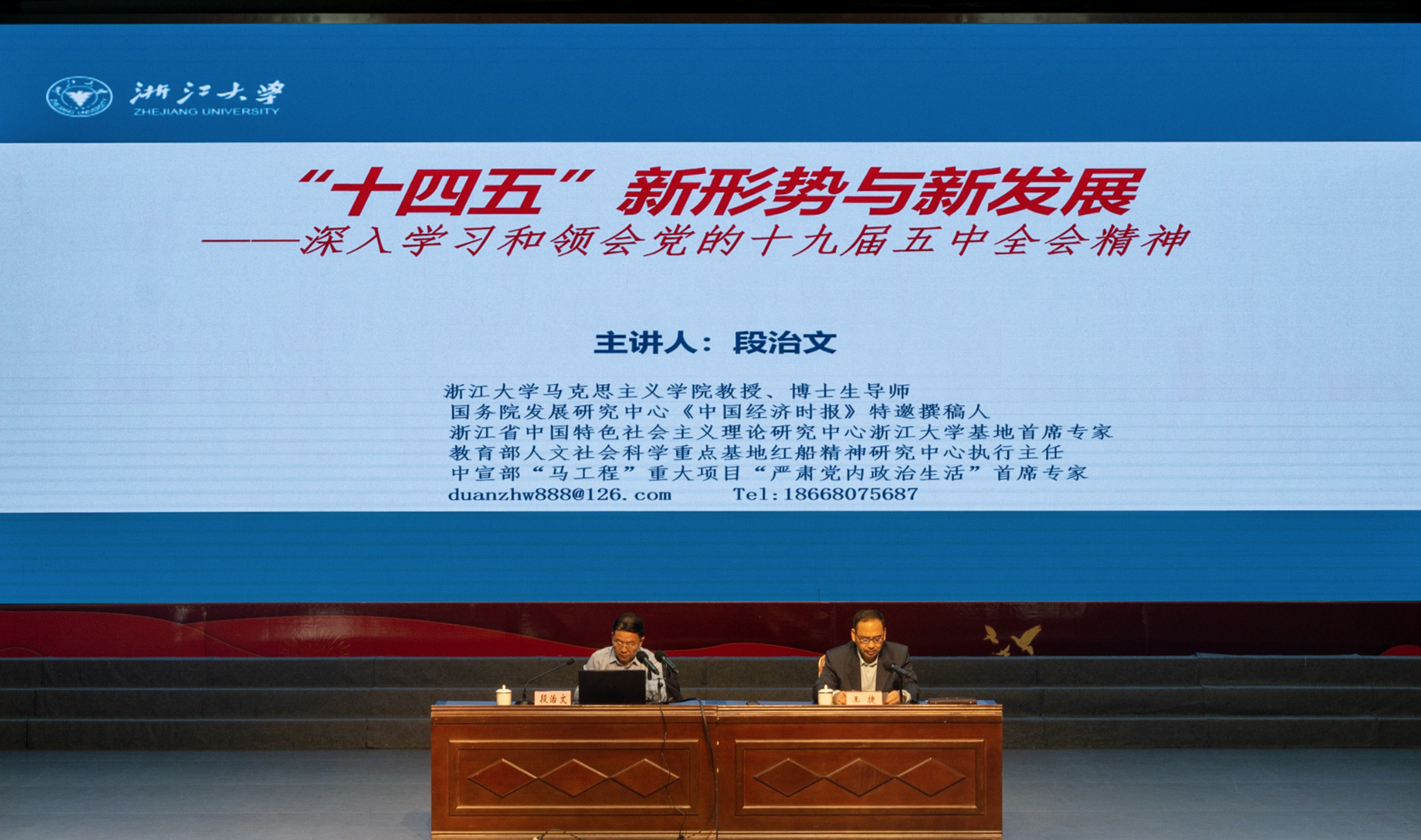 为深入学习宣传贯彻党的十九届五中全会精神,11月17日下午,浙江海洋大学在杨存国会展中心报告厅召开学习十九届五中全会精神报告会,邀请了浙江大学马克思主义学院的段治文教授做专题报告。校党委副书记王捷主持报告会。报告会上,段治文作了主题为《“十四五”新形势与新发展--学习和领会十九届五中全会精神》专题报...