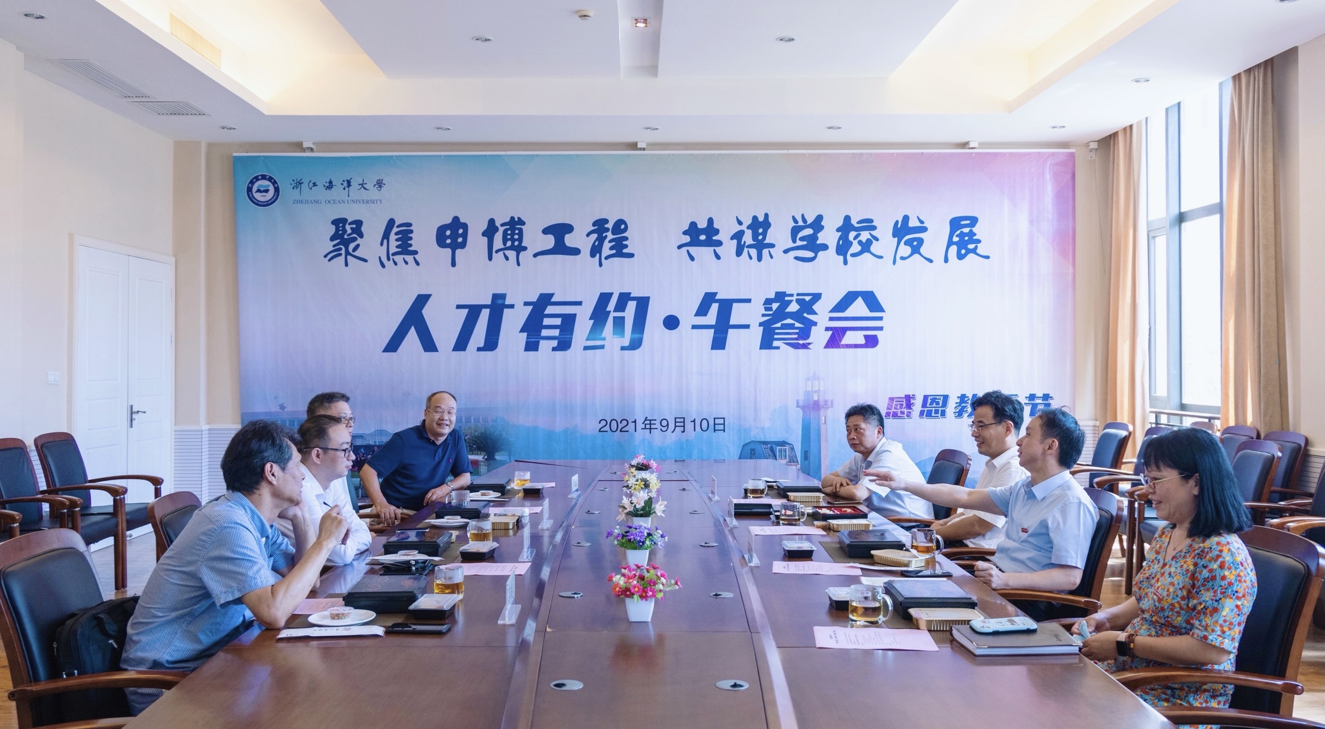 在第37个教师节到来之际,2021年9月10日中午,浙江海洋大学“人才有约˙午餐会”在杨存国会展中心科技工作者之家成功举行。校党委书记严小军、校长陈建孟、副校长张真柱,与高层次人才共进午餐、畅谈发展。午餐会以“聚焦申博工程 共谋学校发展”为主题。会上,学校党委书记严小军鼓励高层次人才充分发挥人才的智囊作用...