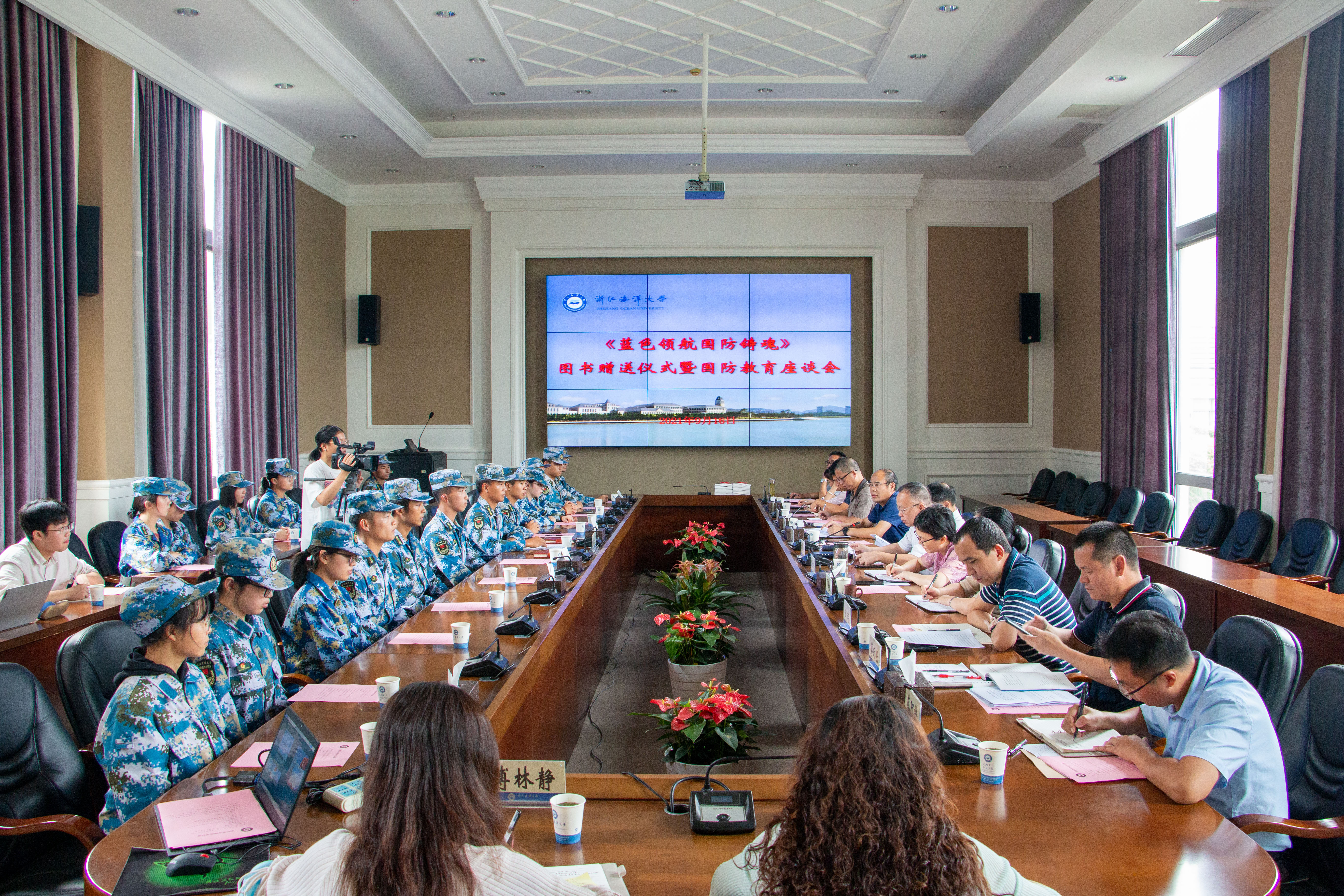全民国防教育日来临前夕,9月16日,浙江海洋大学在行政楼6号会议室举行《蓝色领航 国防铸魂——深植在大海上的浙江海洋大学国防教育》图书赠送仪式暨国防教育座谈会。学校党委副书记叶舟、副校长谢永和出席会议并讲话,办公室、宣传部、教务处、人武部、船舶与海运学院、师范学院、马克思主义学院、体育与军训教育部、图...