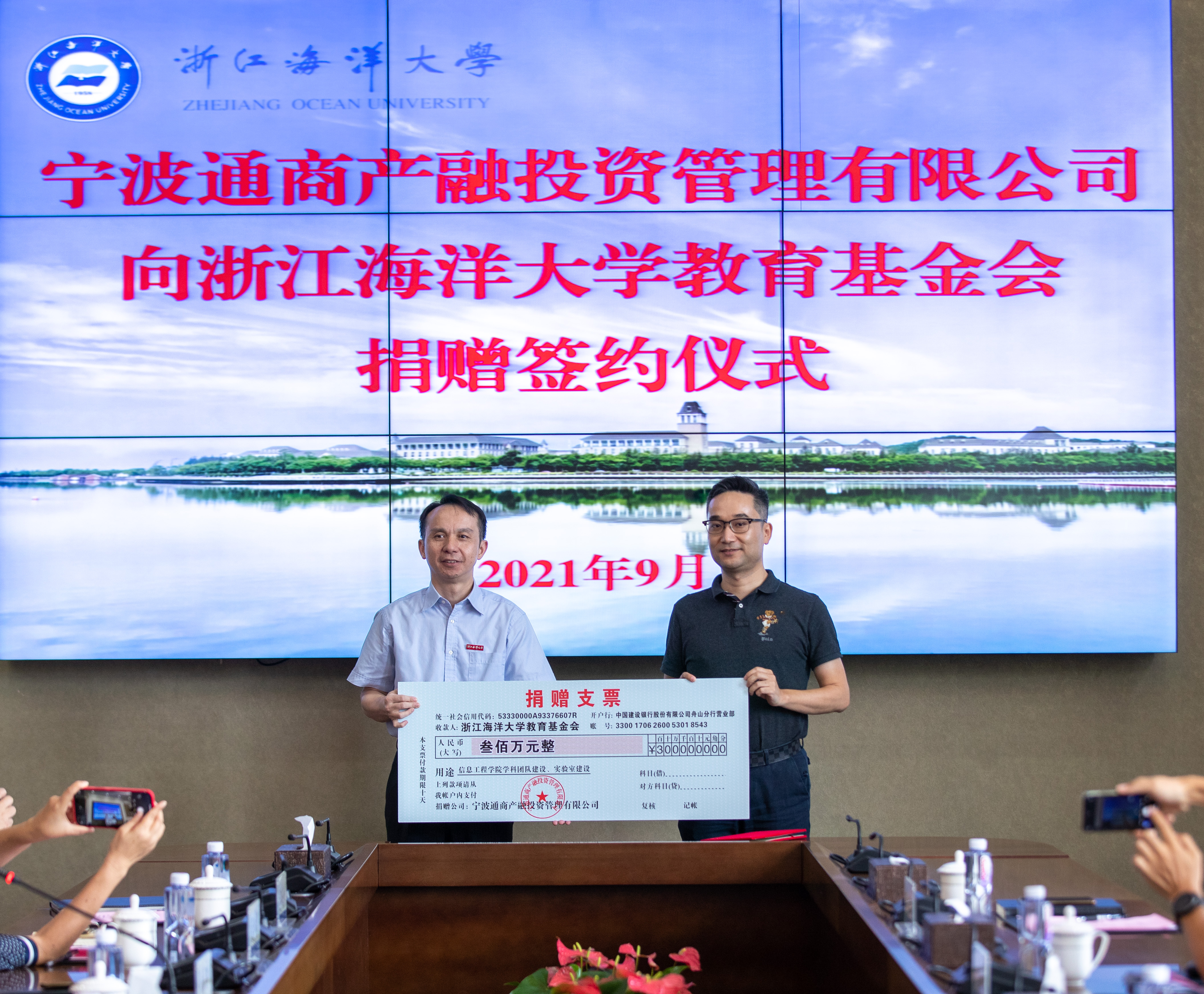 9月24日下午,宁波通商产融投资管理有限公司董事长章翚、总经理吴大可一行代表企业向浙江海洋大学教育基金会捐赠签约仪式在浙江海洋大学新城校区6号会议室举行。浙江海洋大学校长陈建孟、副校长徐汉祥以及校友办、计财处、信息工程学院等负责人和部分师生代表参加捐赠仪式。捐赠签约仪式上,宁波通商产融投资管理有限公...