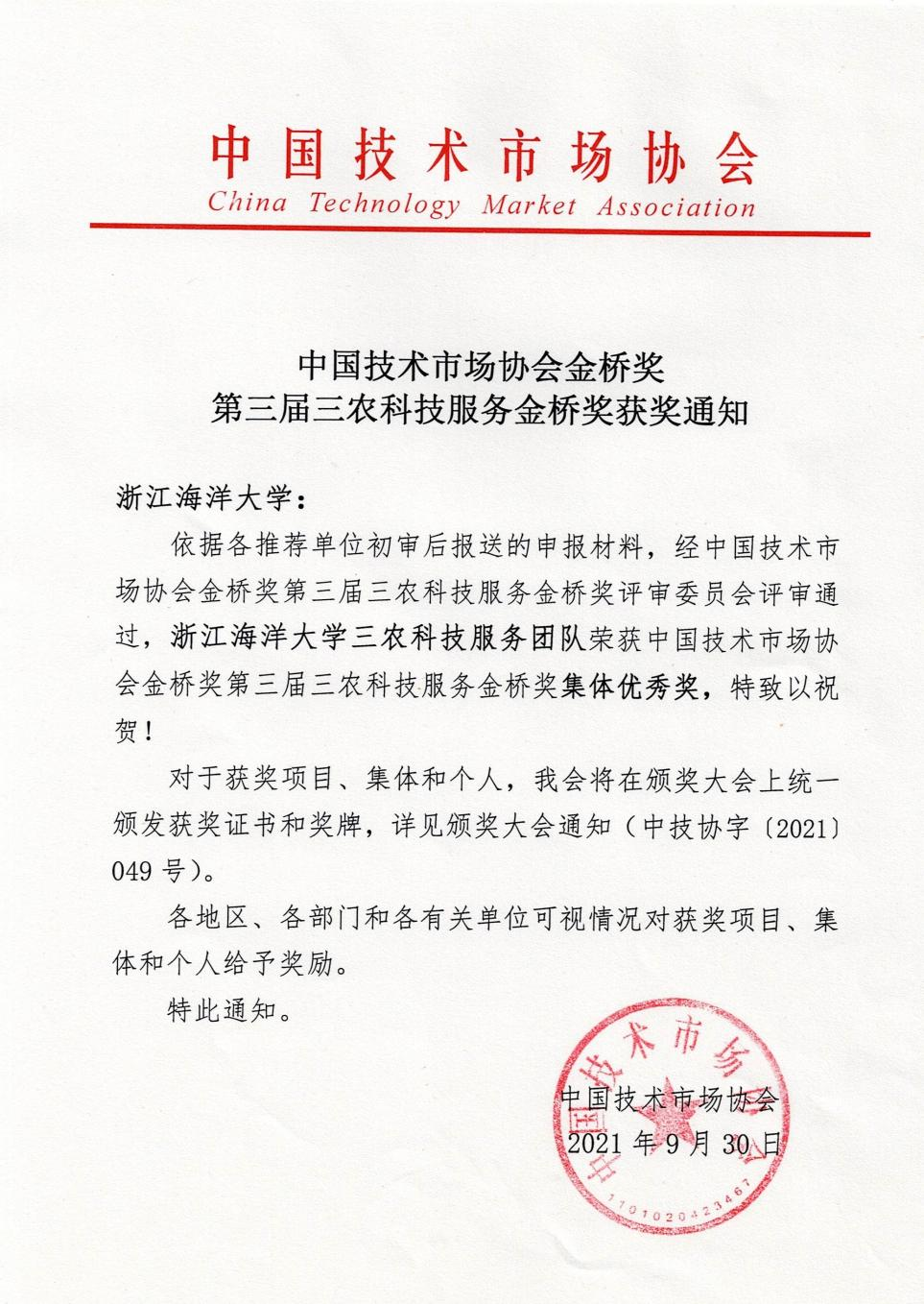 9月30日,中国技术市场协会发布第三届“三农”科技服务金桥奖获奖结果,我校获评优秀集体。过去两年里,合作发展处组织了由10位教授、博士组成的“三农科技服务”团队,他们下海岛、走渔村,推广现代渔业发展理念和技术,培训了当地渔技管理干部,提出了多项建议被当地政府采纳应用。其中,编制的《象山县现代渔港经济...