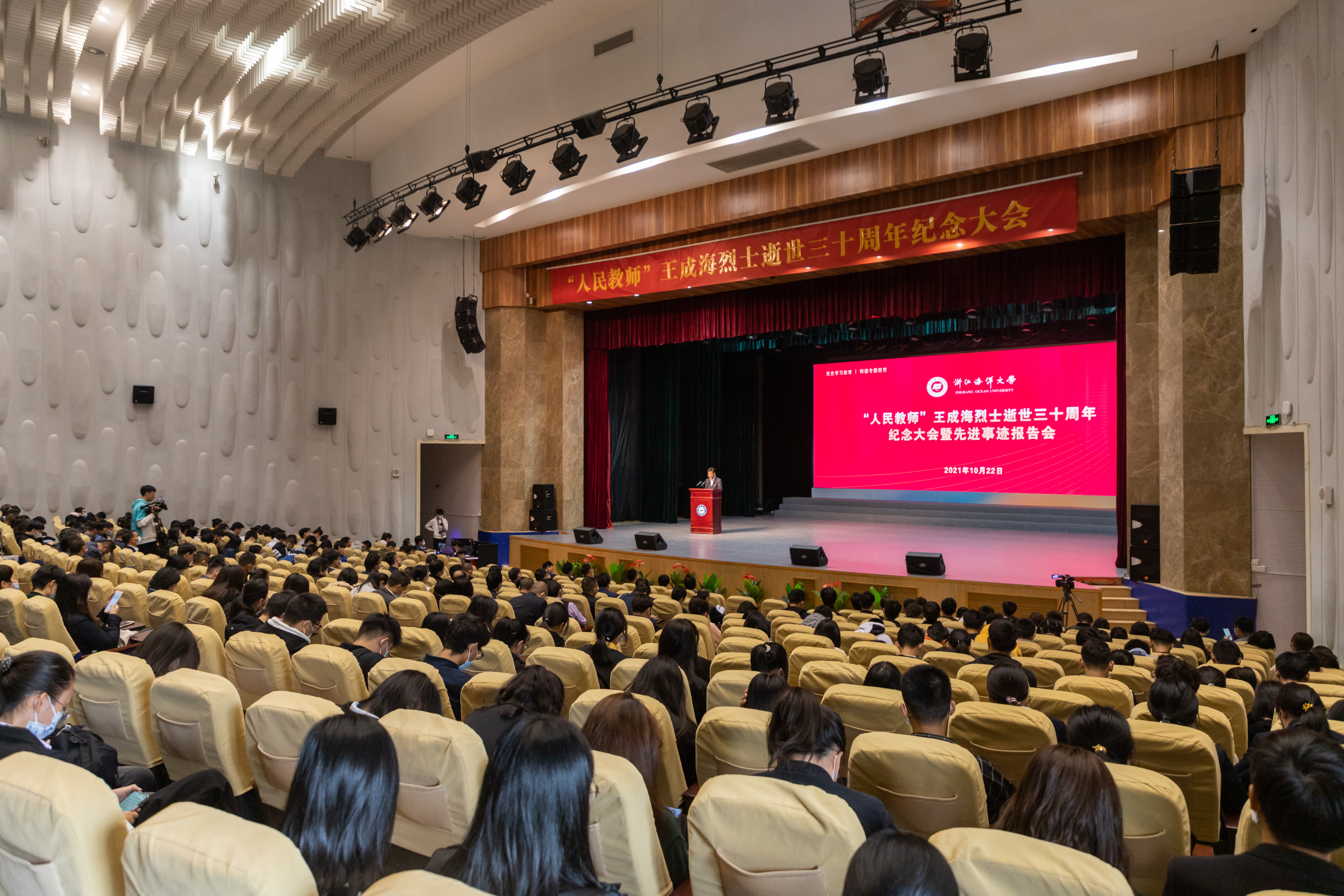 10月22日,浙江海洋大学在杨存国会展中心报告厅隆重举行“人民教师”王成海烈士逝世三十周年纪念大会暨先进事迹报告会。学校党政领导班子成员,王成海亲属代表,校友代表,全体中层干部,师生代表共700余人参加大会。大会由校党委副书记王捷主持。上午10时,大会正式开始,学校国防青年先锋连向王成海烈士雕像敬献花篮。...