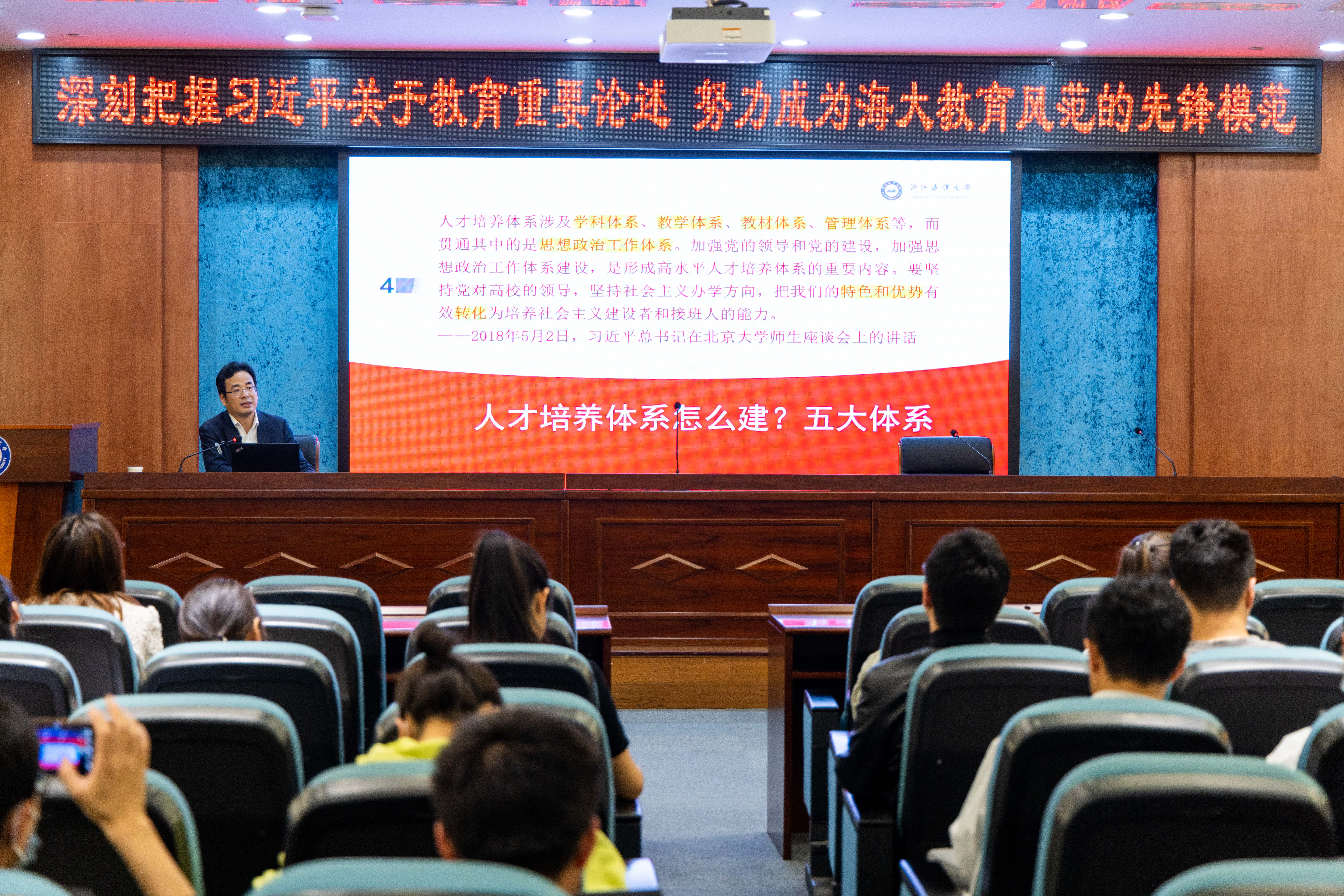 为深入学习习近平总书记关于教育重要论述精神,全面贯彻党的教育方针,落实立德树人根本任务,5月6日下午,在学校新城校区图书馆一楼报告厅,教师教学发展中心组织举办了习近平总书记关于教育重要论述的专题讲座。讲座由校党委书记严小军主讲,近百名新教师现场聆听了“深刻把握习近平关于教育重要论述,努力成为海大教...