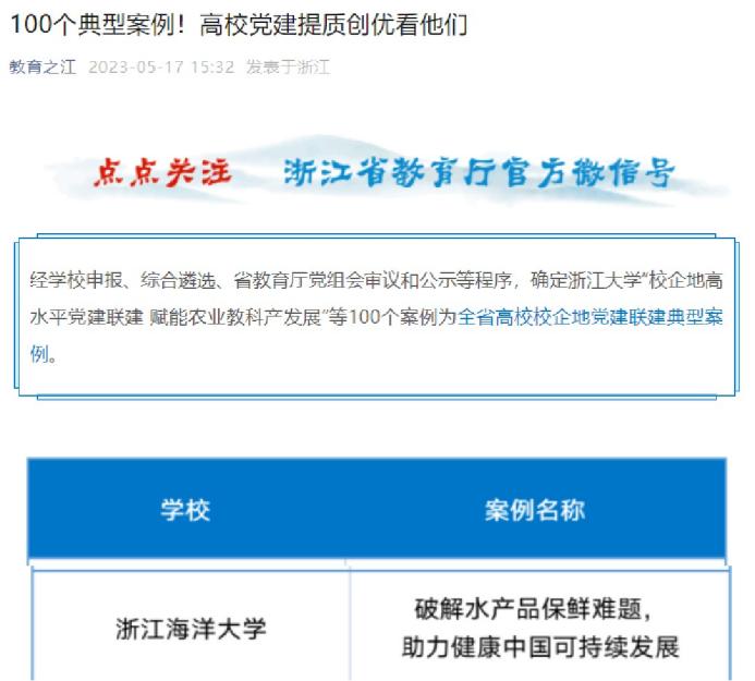 根据省委办《关于全面实施“四个融合”行动,深化“抓院促系、整校建强”工程,推动高校党建提质创优的意见》,结合省委组织部《关于开展党建联建典型案例推荐工作的通知》要求,经学校申报和综合遴选,浙江海洋大学食品与药学学院党委申报的“破解水产品保鲜难题,助力健康中国可持续发展”成功入选“全省高校校企地党...
