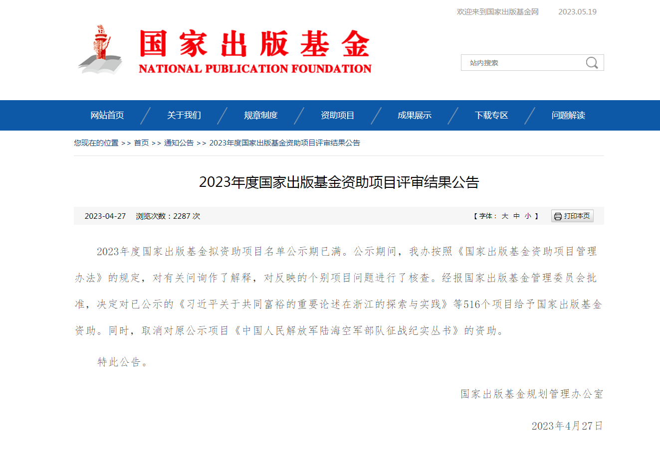 近日,2023年国家出版基金资助项目入选名单正式下达。我校师范学院程继红教授的《中国海洋古文献总目提要》(江西教育出版社有限责任公司)入选资助项目名单,实现了学校在国家出版基金资助项目上的新突破。国家出版基金设立于2007年,是继国家社会科学基金、国家自然科学基金之后,以国家名义设立的第三个专项基金,是...