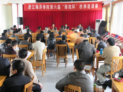 4月24日、25日,浙江海洋学院举办了第六届“海院杯”桥牌邀请赛。来自兄弟高校和本市的12支桥牌队应邀参加比赛,团体比赛采用瑞士制每轮打16副牌。经过两天的角逐,舟山市农业银行队、宁波大学队、浙江海事局队分获团体前三名。 此次桥牌赛得到我校领导的高度重视和市桥协的大力支持。副校长、校桥牌协...